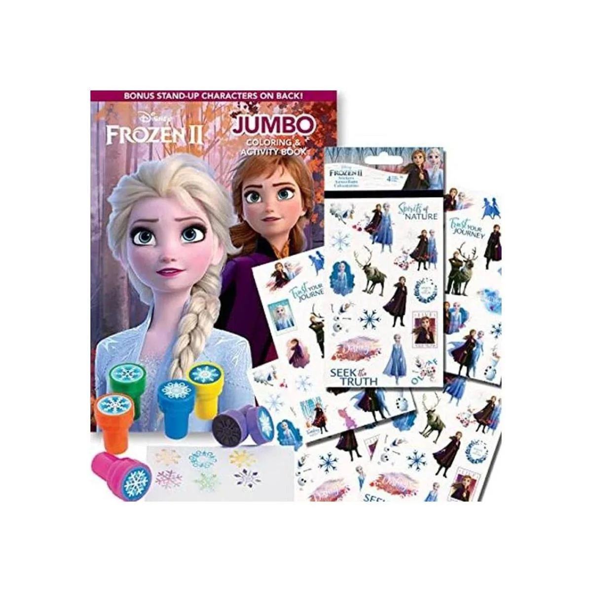 Este juego incluye un libro de colorear y actividades de Frozen 2 80 páginas, la cubierta puede variar, una almohadilla de 2 pegatinas con escenas de juego y 6 sellos de copo de nieve.