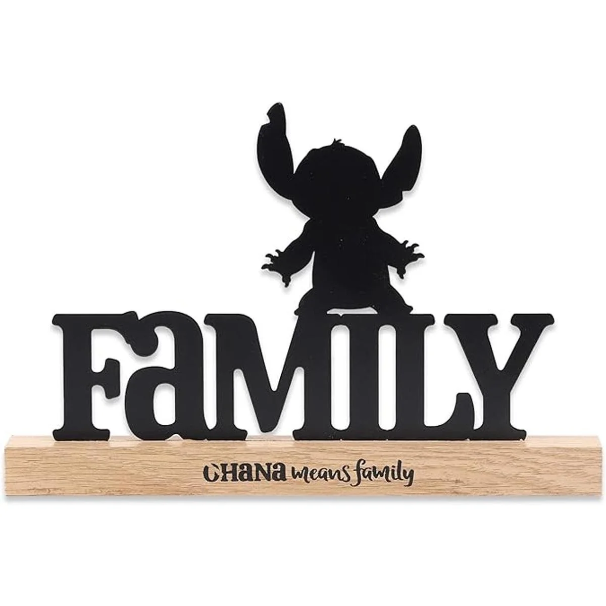 Disney Lilo and Stitch Ohana Means Decoración de mesa familiar Silueta metálica cosida sobre base de madera natural
