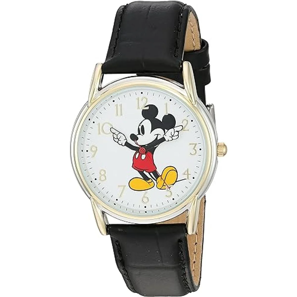 Disney Mickey Mouse Reloj analógico con correa de cuero de cuarzo clásico Cardiff para adultos, Negro