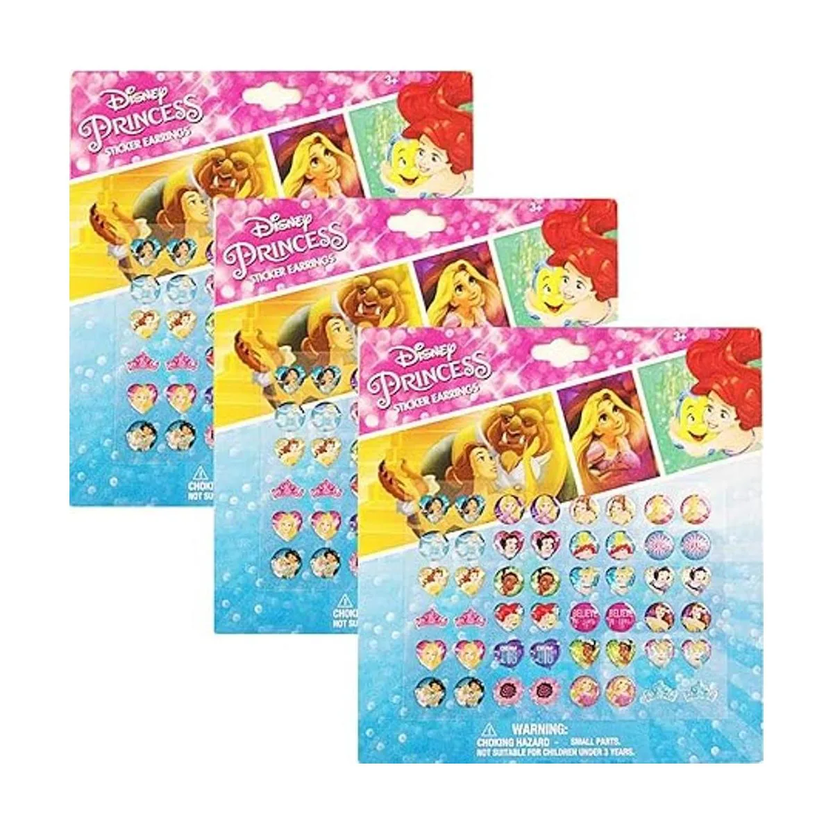 Incluye 3 paquetes de aretes de princesa Disney con 24 pares cada uno