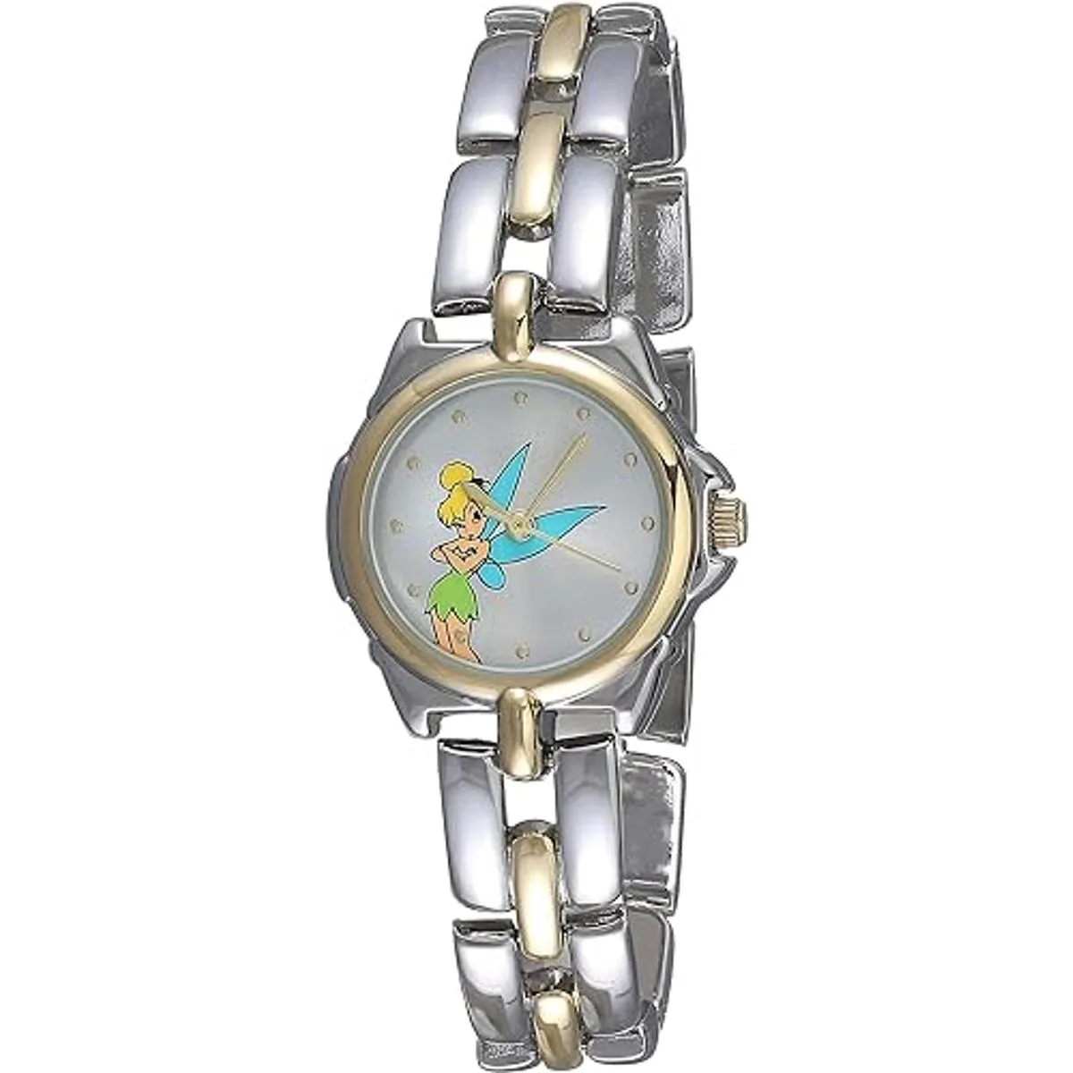 Este reloj Tinkerbell de dos tonos no solo con imagen de Campana de Campana a todo color en la esfera, esfera de rayos de sol plateada con puntos de oro, sino también con cierre de joyería, acabado pulido y movimiento de cuarzo de calidad.