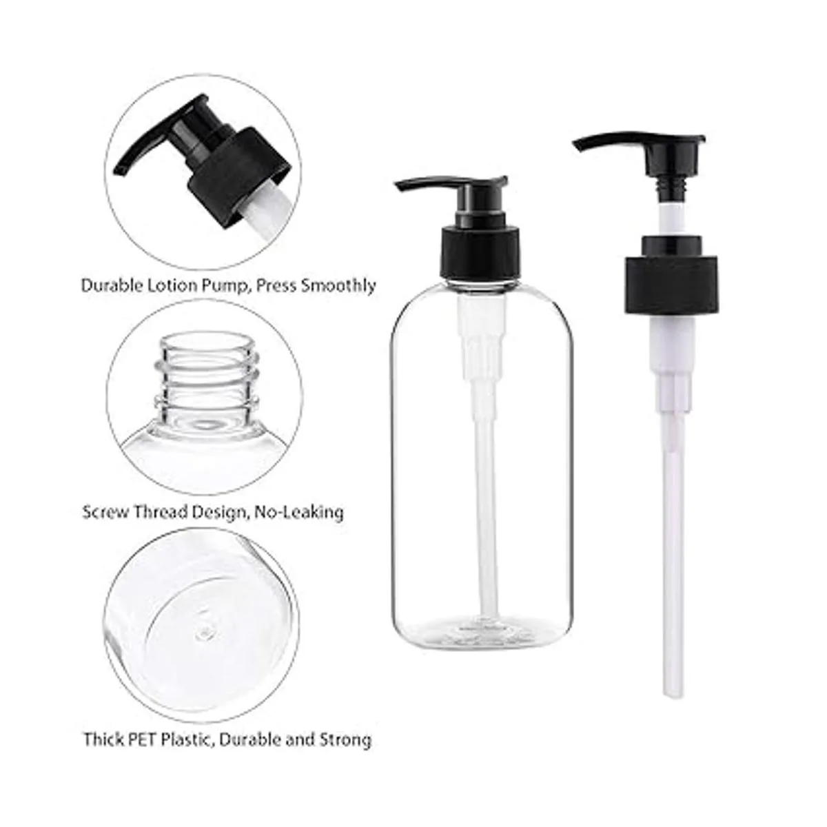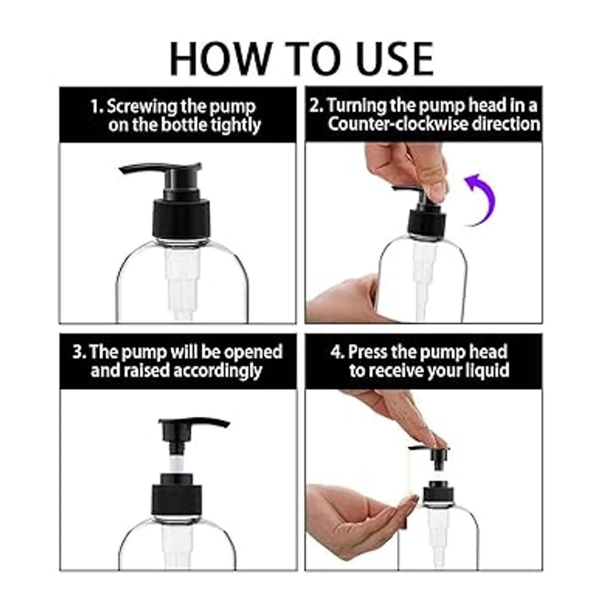 Calidad superior: las 4 botellas de bomba están hechas de plástico PET grueso de grado alimenticio, fuerte y duradero, ecológico y seguro, poseen una excelente claridad y resistente a los impactos. Cuenta con una resistente bomba de loción negra extraíble, que presiona muy suavemente, lo que te da una agradable sensación cuando se usa.
