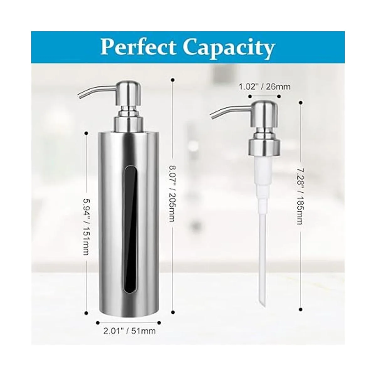 Dispensador de jabón de manos para baño, dispensador de jabón de platos de acero inoxidable para cocina, botella de bomba líquida decorativa delgada a prueba de óxido para jabón de platos, champú, loción, 7 onzas
