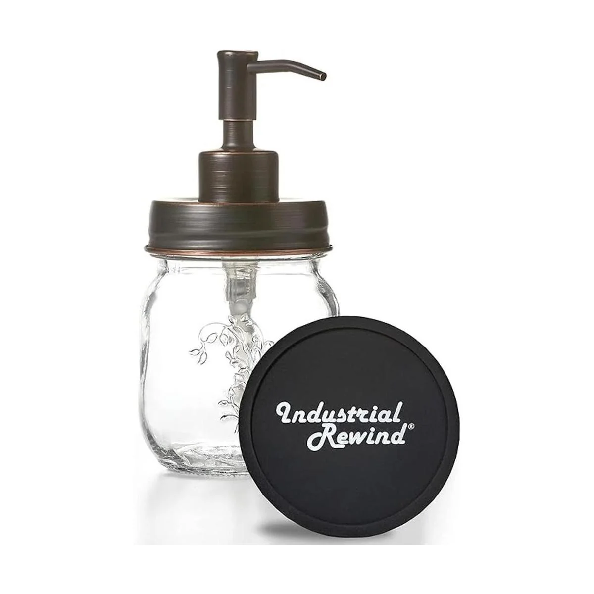 Industrial Rewind Tarro Mason con una bomba dispensadora de jabón con acabado de bronce aceitado con tapa de tarro resistente a la corrosión y sello para evitar fugas y derrames. Viene con nuestra bomba dispensadora de jabón fiable de acción suave comparable a un dispensador de jabón comercial. También viene con posavasos de rebobinado industrial para dar una parte inferior antideslizante
