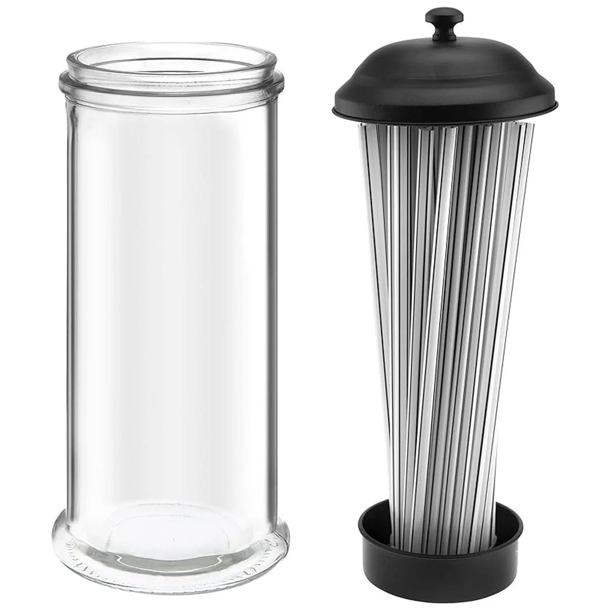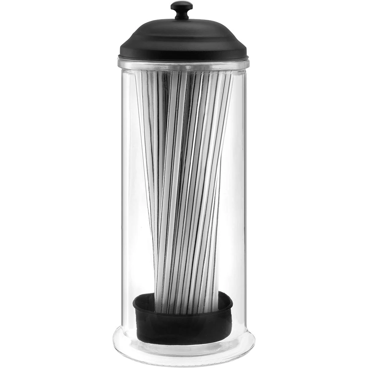 Dispensador de paja con tapa de acero inoxidable, soporte de paja de vidrio para encimera con tapa, dispensadores de paja para beber, recipiente de pajita, soporta popotes de hasta 8.5 pulgadas, color negro