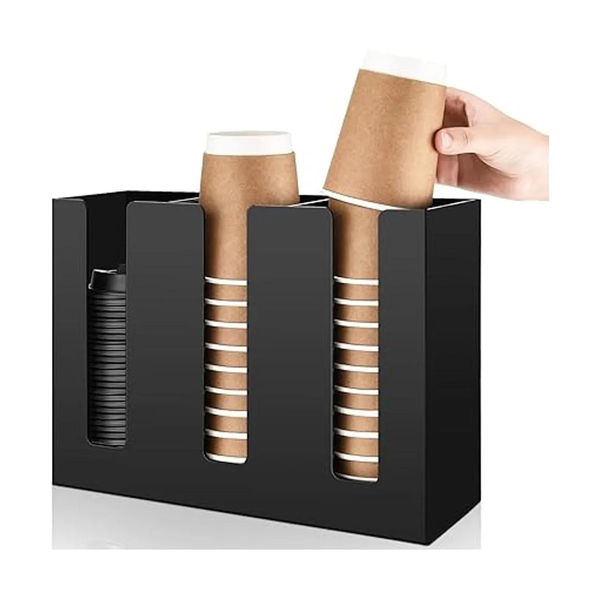 Dispensador de tazas de café acrílico de 3 compartimentos, organizador de vasos de papel, soporte de tapa de taza desechable, suministros de cafetería, portavasos de papel, organizador de almacenamiento para mostrador de pared negro
