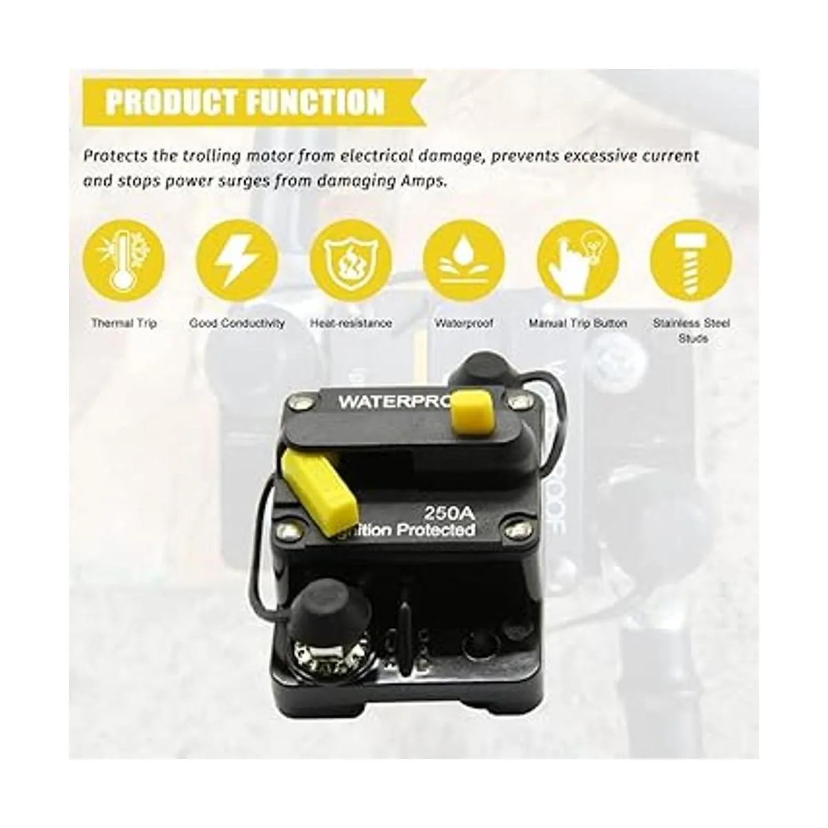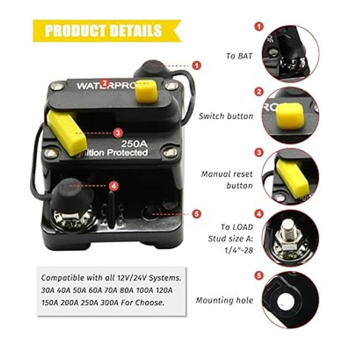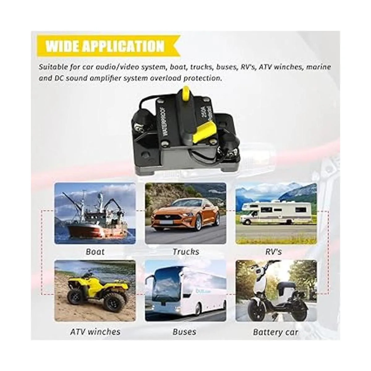 Disyuntor de audio de 250 amperios para montaje en superficie con reinicio manual, 12 V 48 V CC, impermeable 250 A