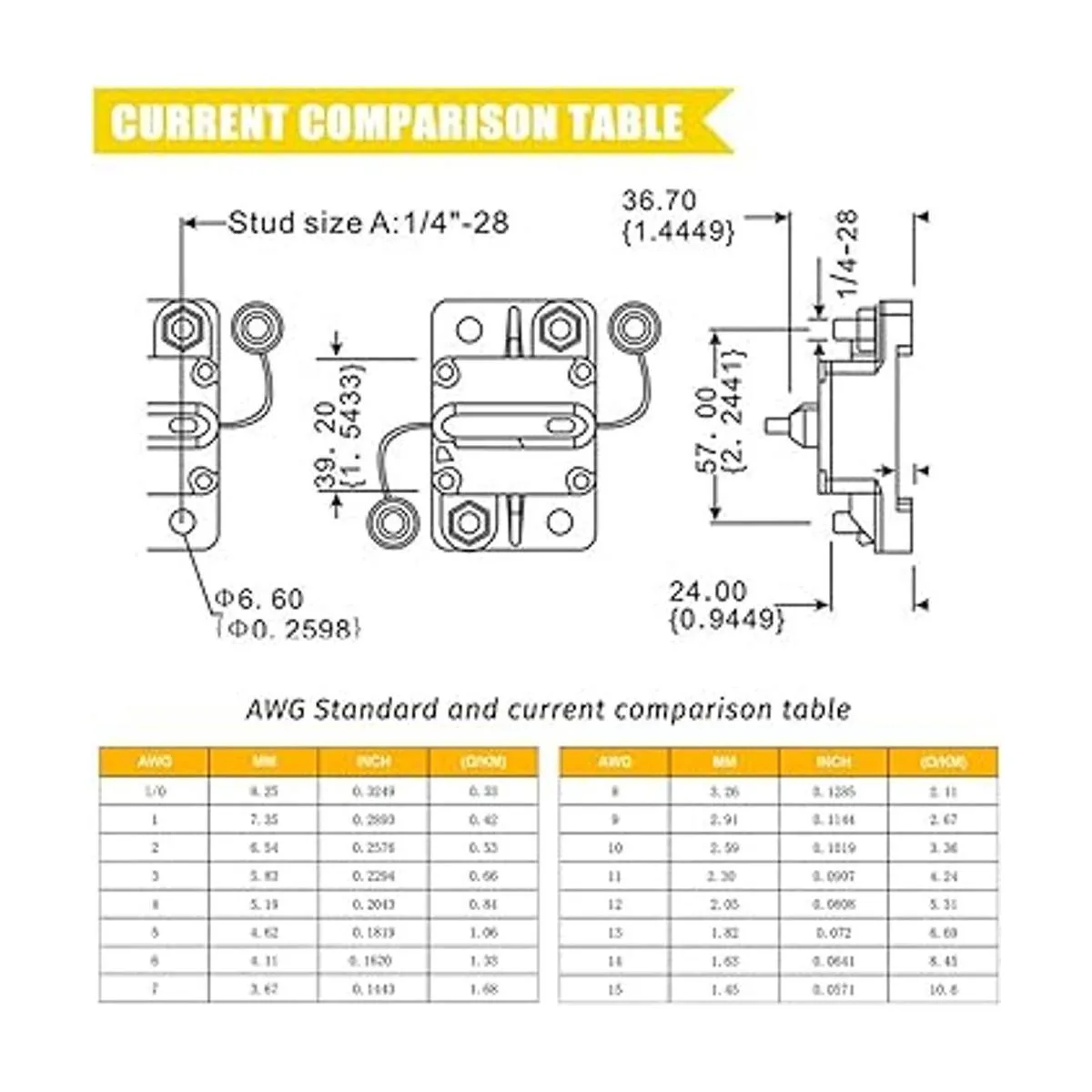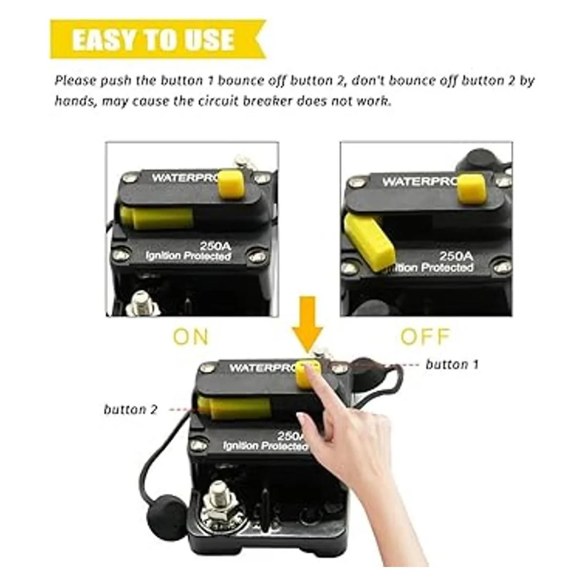 Especificaciones: Compatible con todos los interruptores de interruptor de 250 A, 1248 V, botón de reinicio manual amarillo, para protección de sobrecarga de corriente del sistema de audio de barcos marinos.