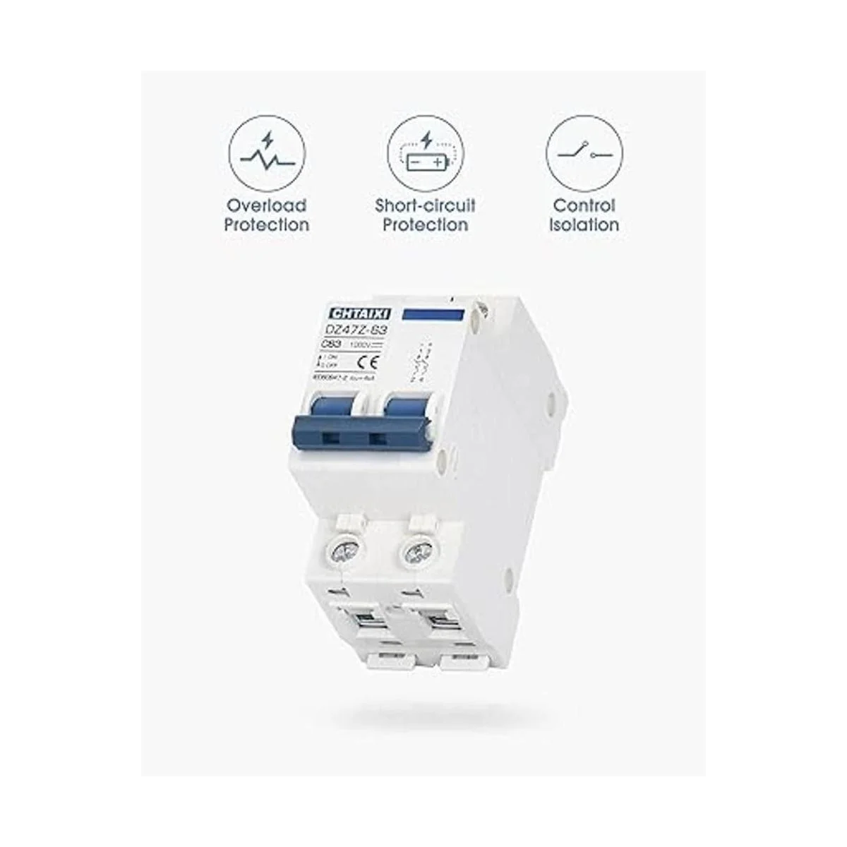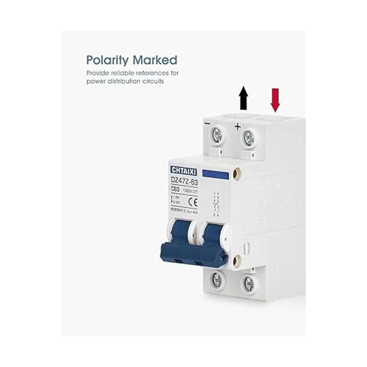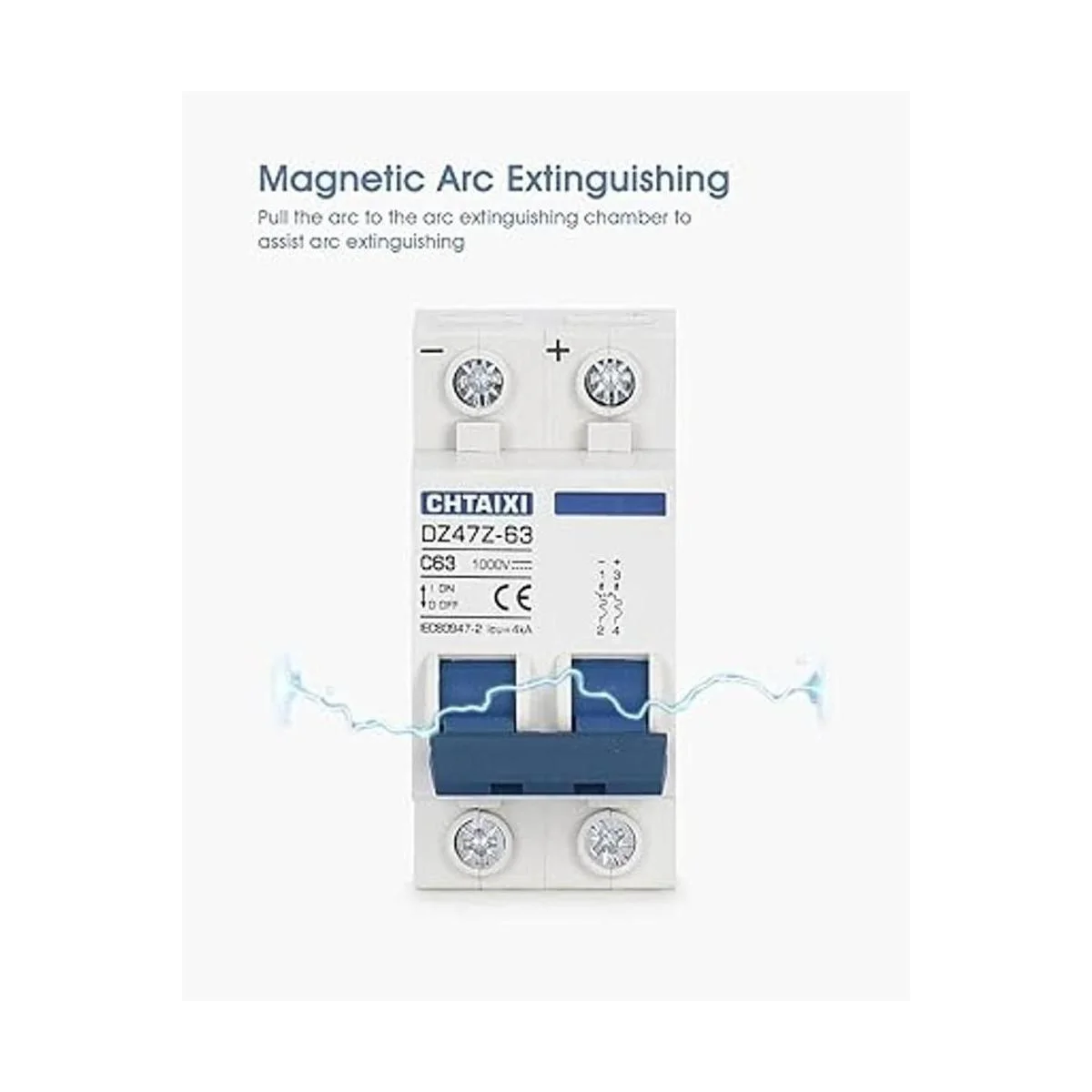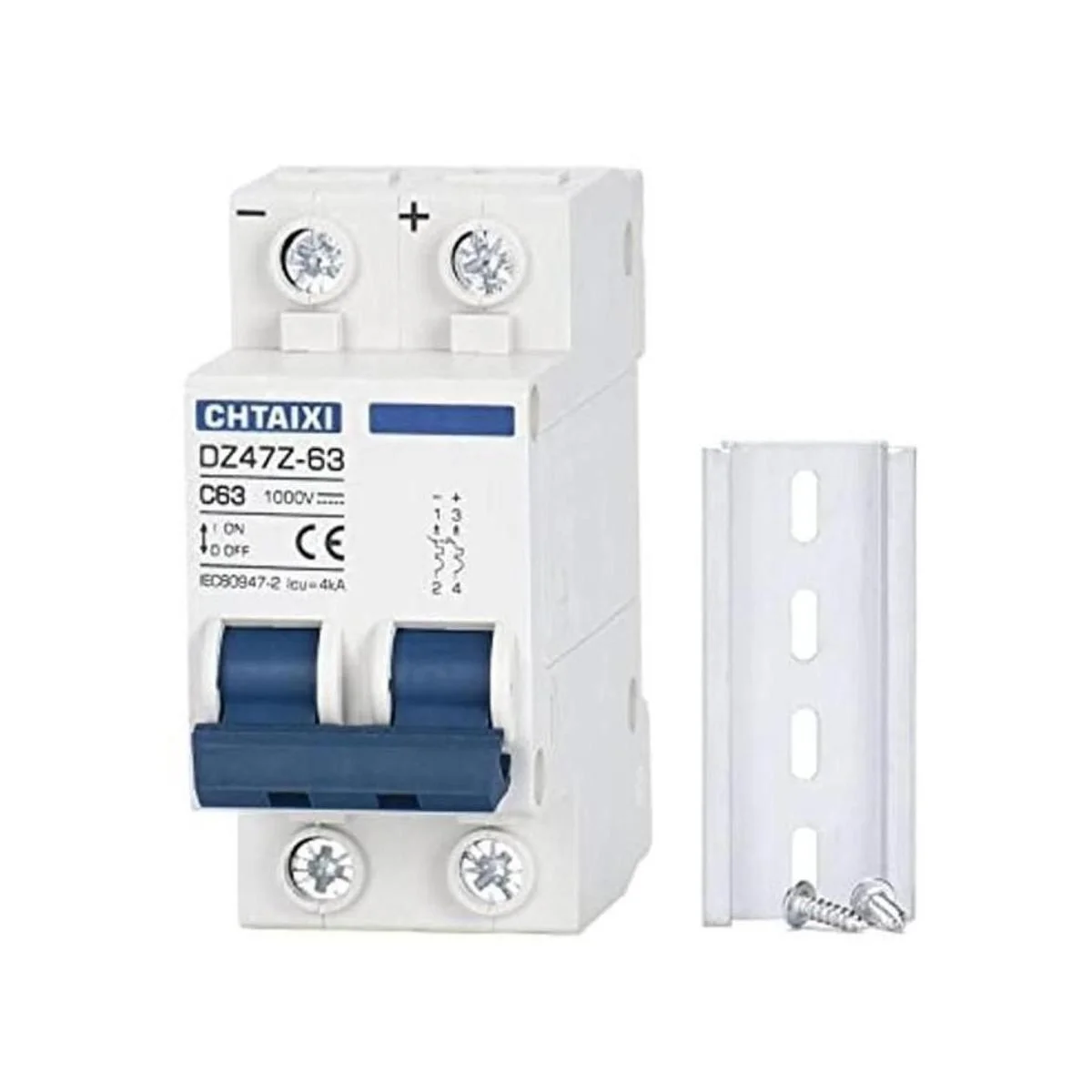 Disyuntor miniatura de CC, 2 polos, 1000 V y 63 amperios para sistema solar fotovoltaico, viaje magnético térmico, montaje en riel DIN, interruptor de desconexión CC Chtaixi C63