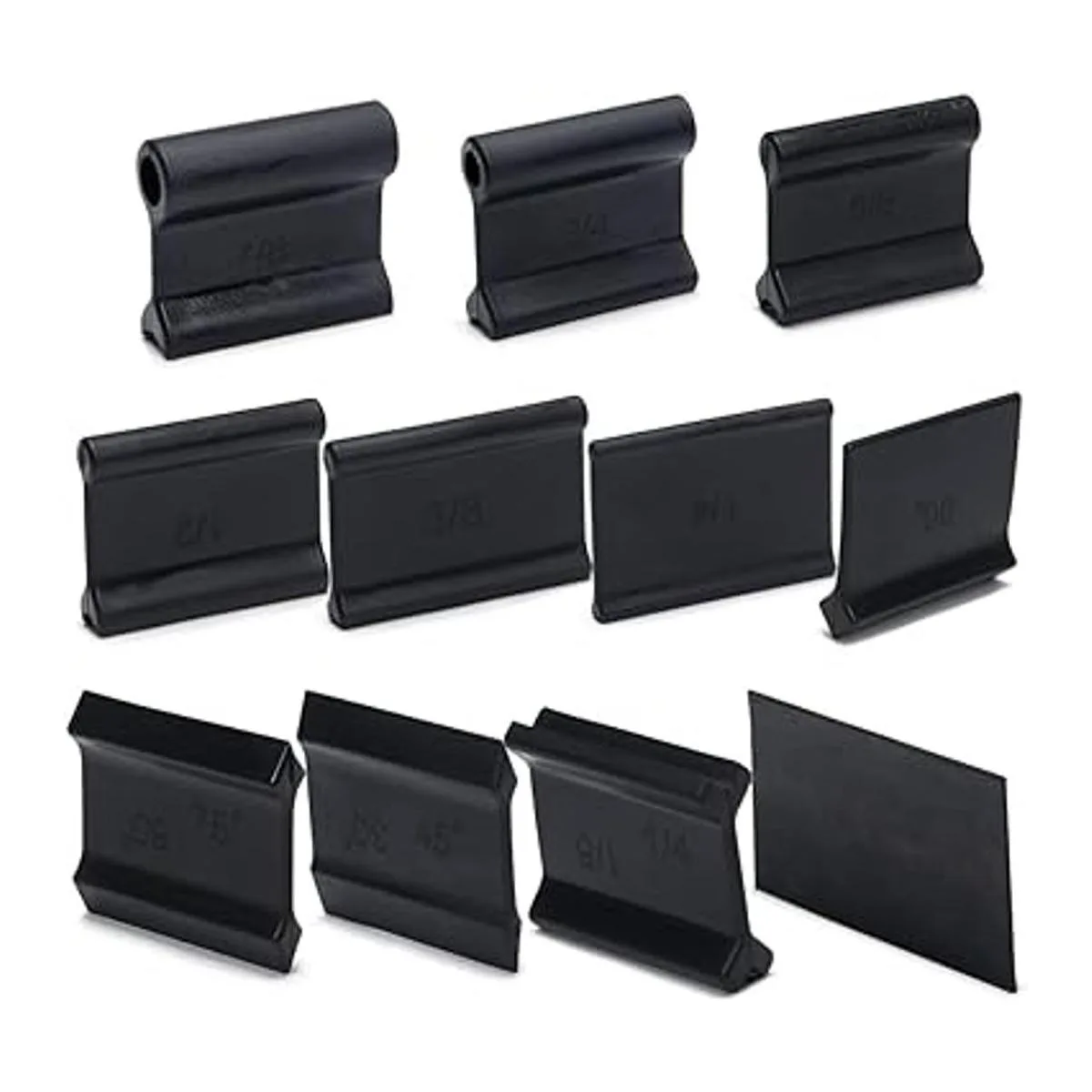 Para todo tipo de formas: 1 almohadilla plana flexible, 1/8 y 1/4 radio redondo sobre agarre, agarre 90, agarre 60 y 75, agarre 30 y 45 y seis almohadillas de 23/4 de ancho con los siguientes diámetros interior/exterior: 1/4, 3/8, 1/2, 5/8, 3/4 y 7/8 .