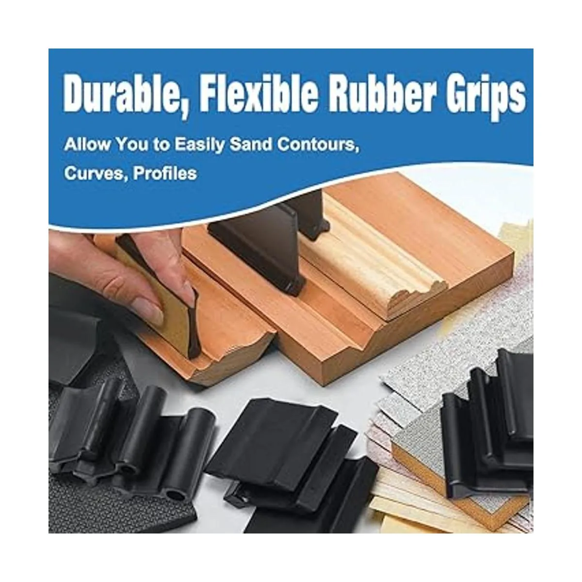 Cómodo: cada agarre de lijado de contorno está hecho de goma flexible y antideslizante, con un perfil cóncavo y convexo en los extremos. El material de goma es lo suficientemente firme como para mantener su forma bien, pero lo suficientemente suave como para adaptarse a pequeñas variaciones en el perfil. La textura de agarre ayuda a evitar que el abrasivo se deslice, lo que también reduce la necesidad de apretar.