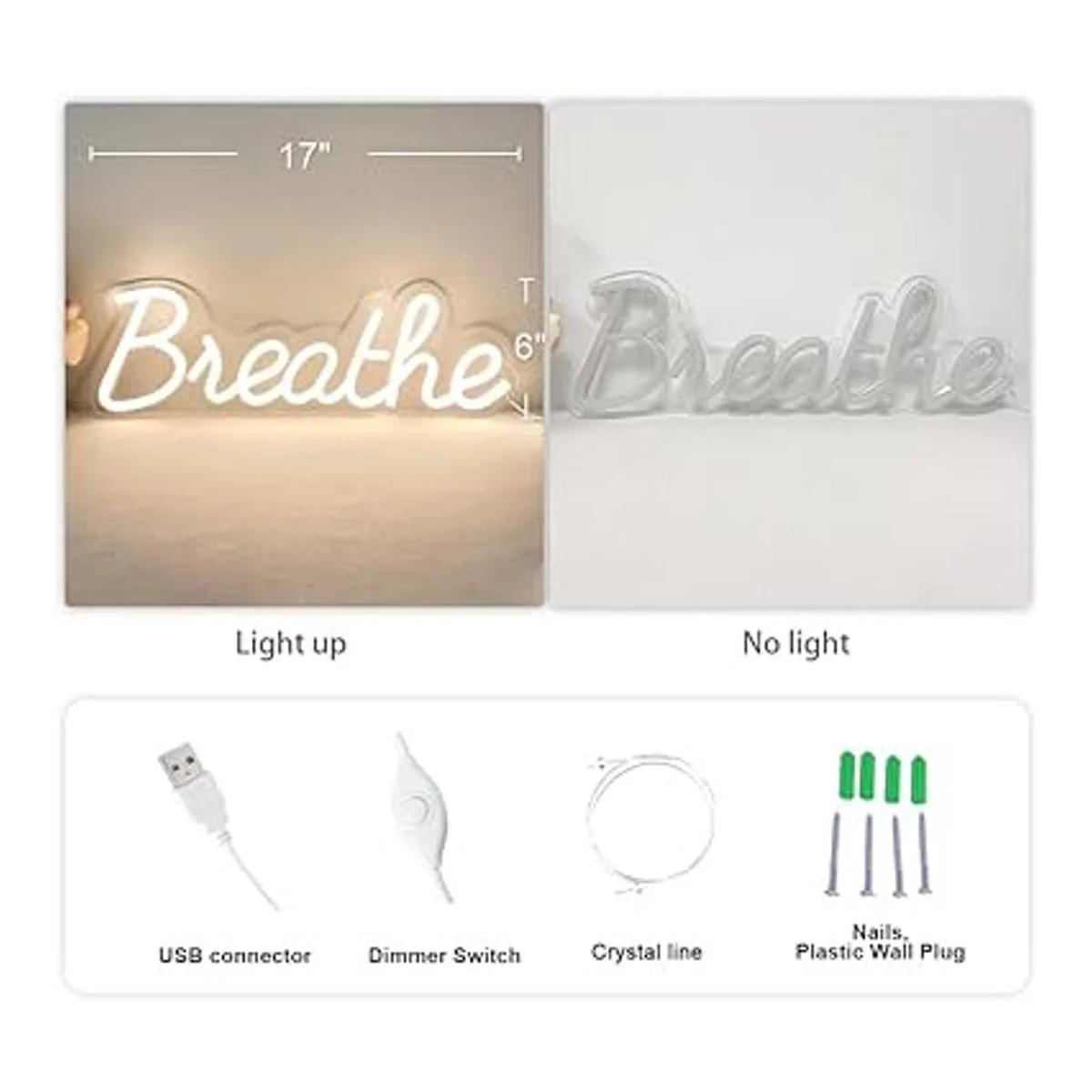 Kit de instalación: el letrero de neón Breathe está equipado con un kit de instalación. Incluye 1 tira de cristal, 4 tornillos y un regulador. Fácil de usar el cartel, simplemente utiliza el banco de energía, cargadores de teléfono o computadora para iluminar. Cada cartel tiene agujeros de montaje preparados con antelación. Se puede colgar en el techo o ventanas, o se puede instalar en la pared.
