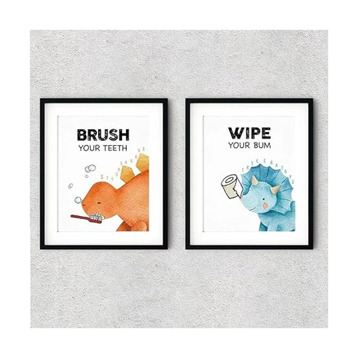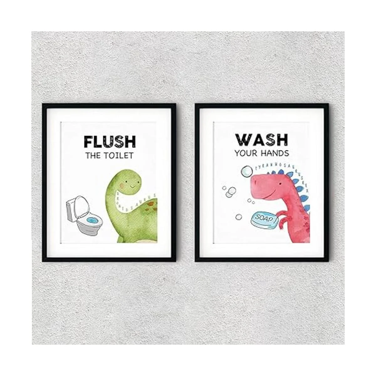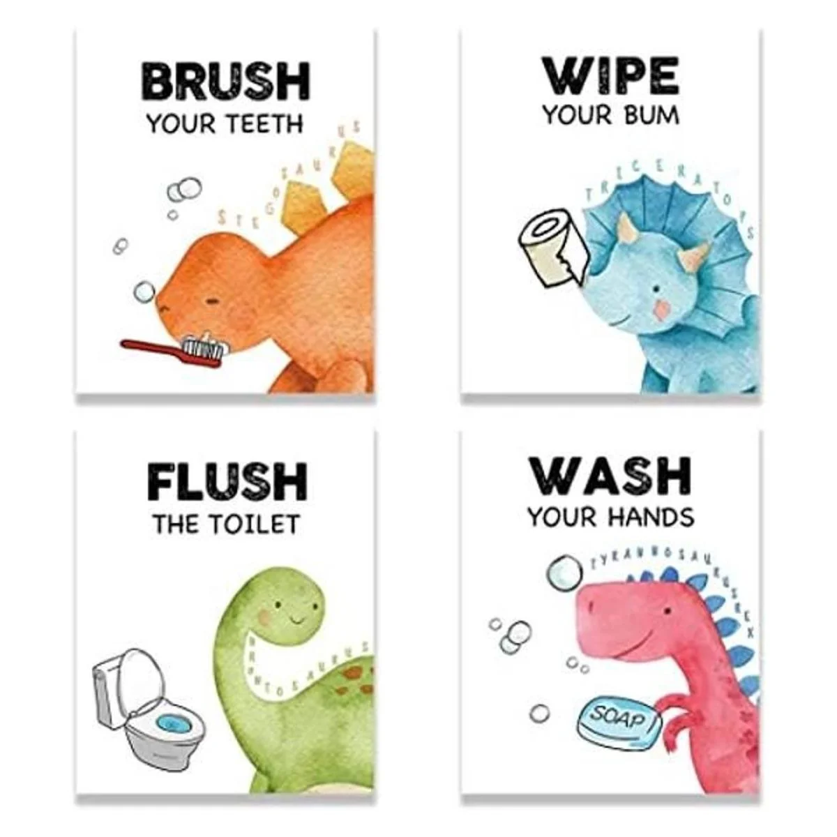 Divertida decoración de baño de dinosaurio, cepillo para lavar a ras de bebé, cuarto de bebé, cuarto de baño, impresiones artísticas para niños, guardería, niños, niñas, hijos, baño, juego de 4 8 x 10 pulgadas sin marco