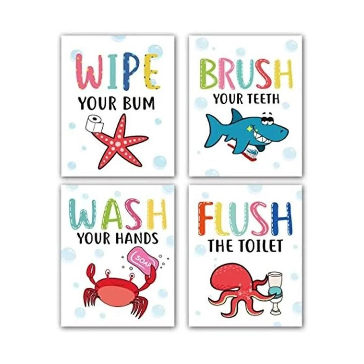 Divertido colorido de dibujos animados con temática de vida marina de baño con citas inspiradoras, impresión artística de citas humorísticas, pintura de reglas de inodoro para niños baño decoración, juego de 4 8 x 10 , sin marco