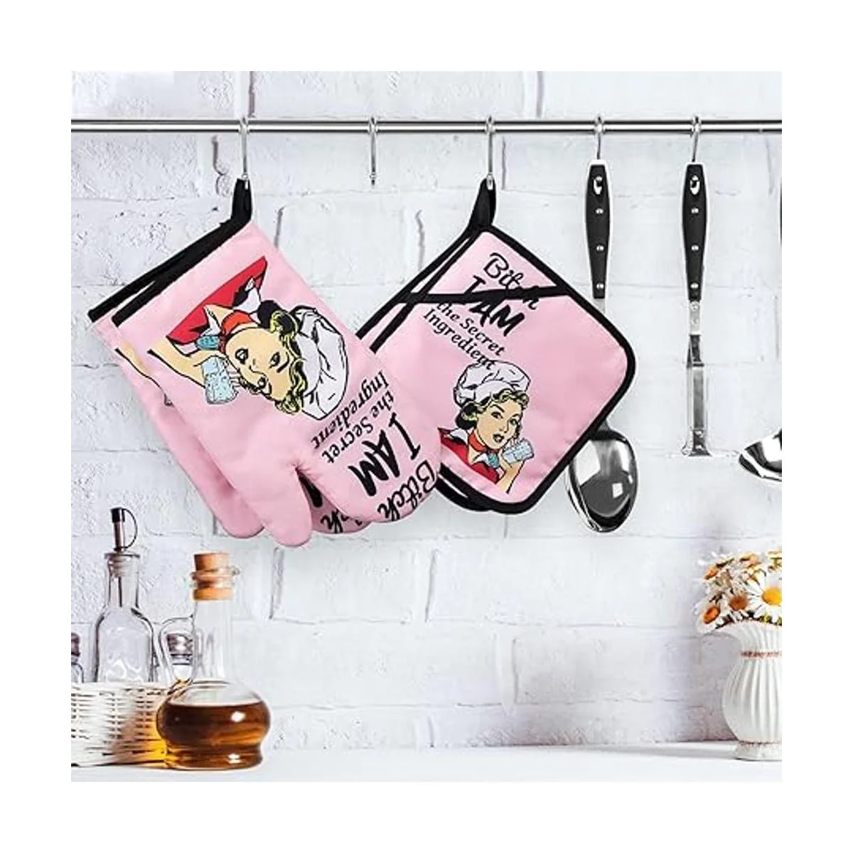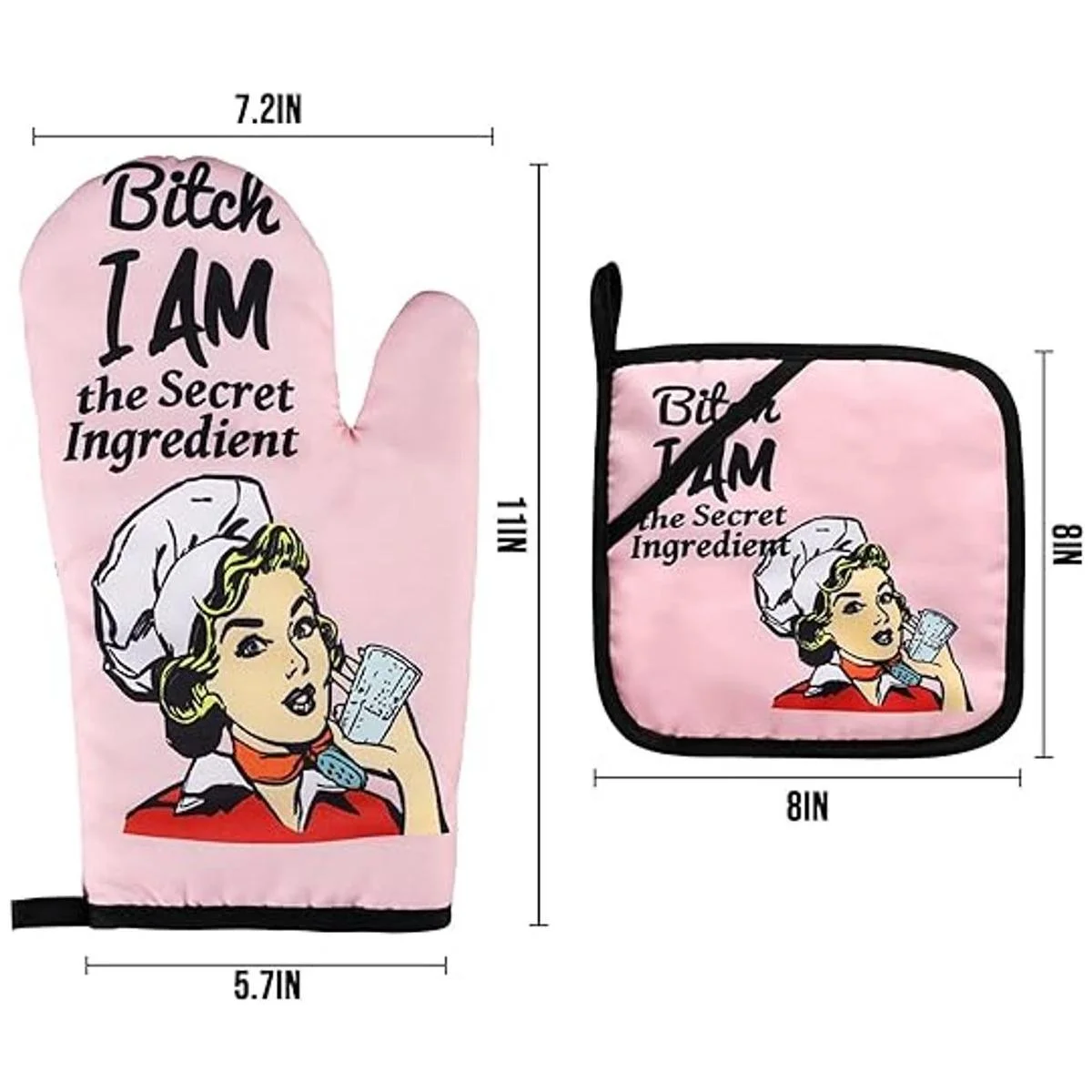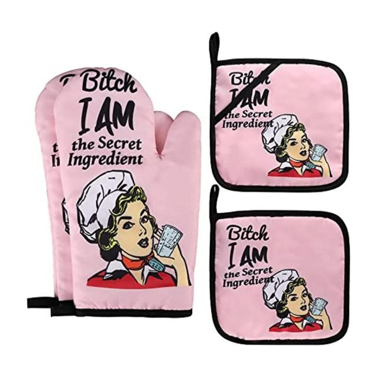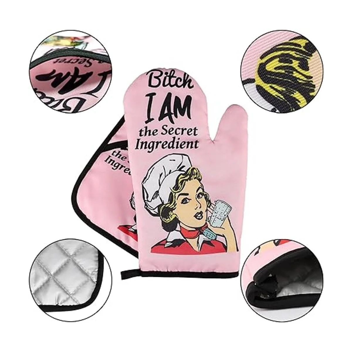 Divertidos guantes de horno, guantes de horno y soportes para ollas, guantes de horno antideslizantes acolchados, guantes de parrilla resistentes al calor, regalos de inauguración de la casa, ingredientes I Am The Secret