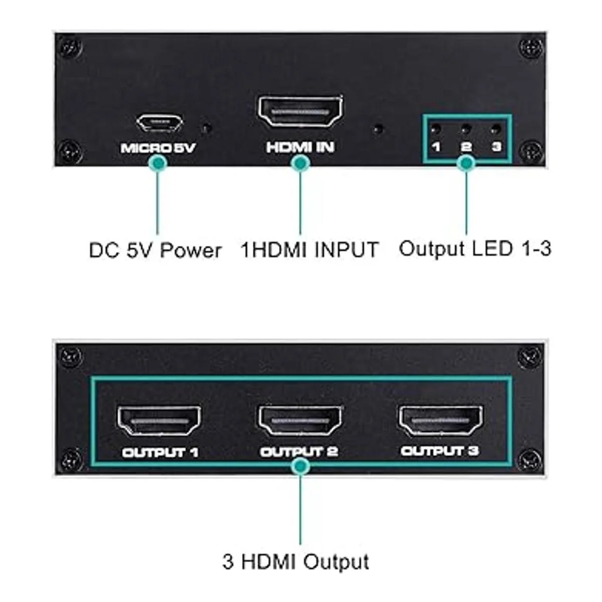 Divisor HDMI 1×3: HDMI Splitter 1×3 distribuye las señales HDMI de entrada a 3 salidas HDMI idénticas simultáneamente. Nota: este divisor HDMI de 1 x 3 simplemente refleja/duplica la pantalla, no es compatible con el modo de extensión que muestra diferentes pantallas, cada pantalla de salida mostrará la misma página. Y ten en cuenta que este es 1 entrada HDMI, 3 divisor de salida HDMI, no 3 entradas HDMI, 1 salida HDMI
