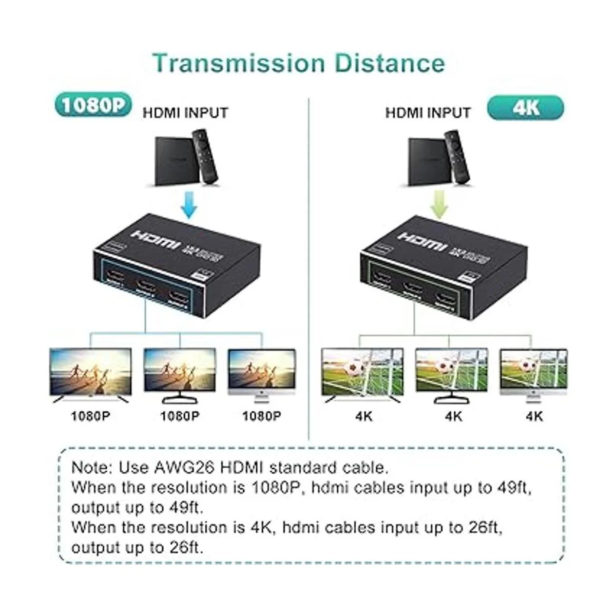 Compatibilidad: HDCP compliant, support Output HDMI 1.4b, HDMI 2160P compatible. Soporte de entrada: Computer, PS3, PS4, Xbox, Bluray DVD player, STB etc. Soporte de salida: proyectores, televisores Full HD, Apple TV, monitor, etc.