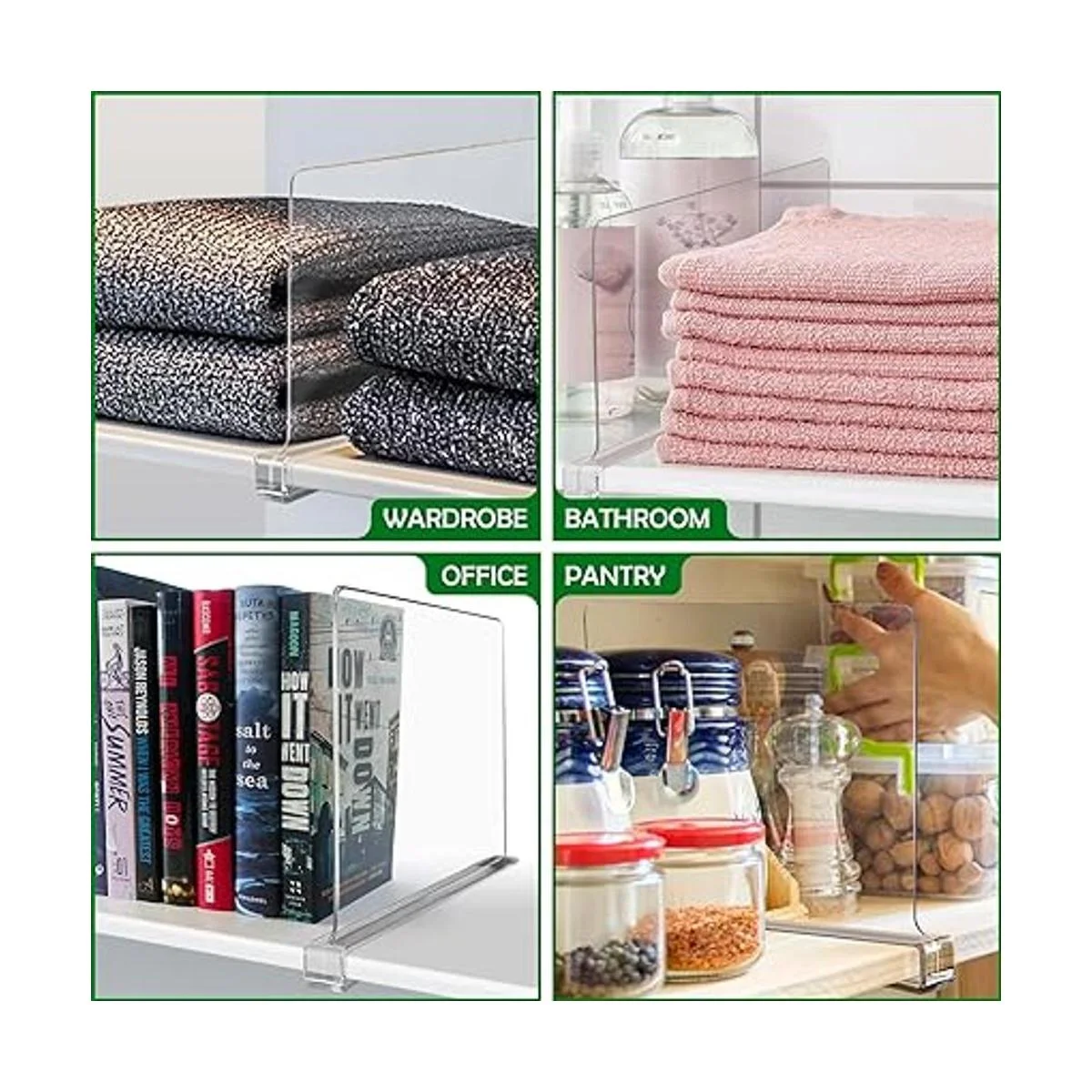 Multifuncional, mantiene ordenado: los separadores de estantes acrílicos son ideales para organizar cosas. Pueden ayudarte a separar estantes grandes en áreas funcionales. Apila ropa, suéteres, jeans, bolsos, zapatos, toallas, mantas, ropa de cama, libros, tarros de especias y otros artículos ordenadamente, manteniendo los artículos en posición vertical para maximizar el espacio de almacenamiento. No solo para tu armario, los separadores de estantes también son perfectos para tu cocina, despensa, dormitorio, oficina, garaje, espacio vital. Haz que tu hogar esté más limpio y ordenado.