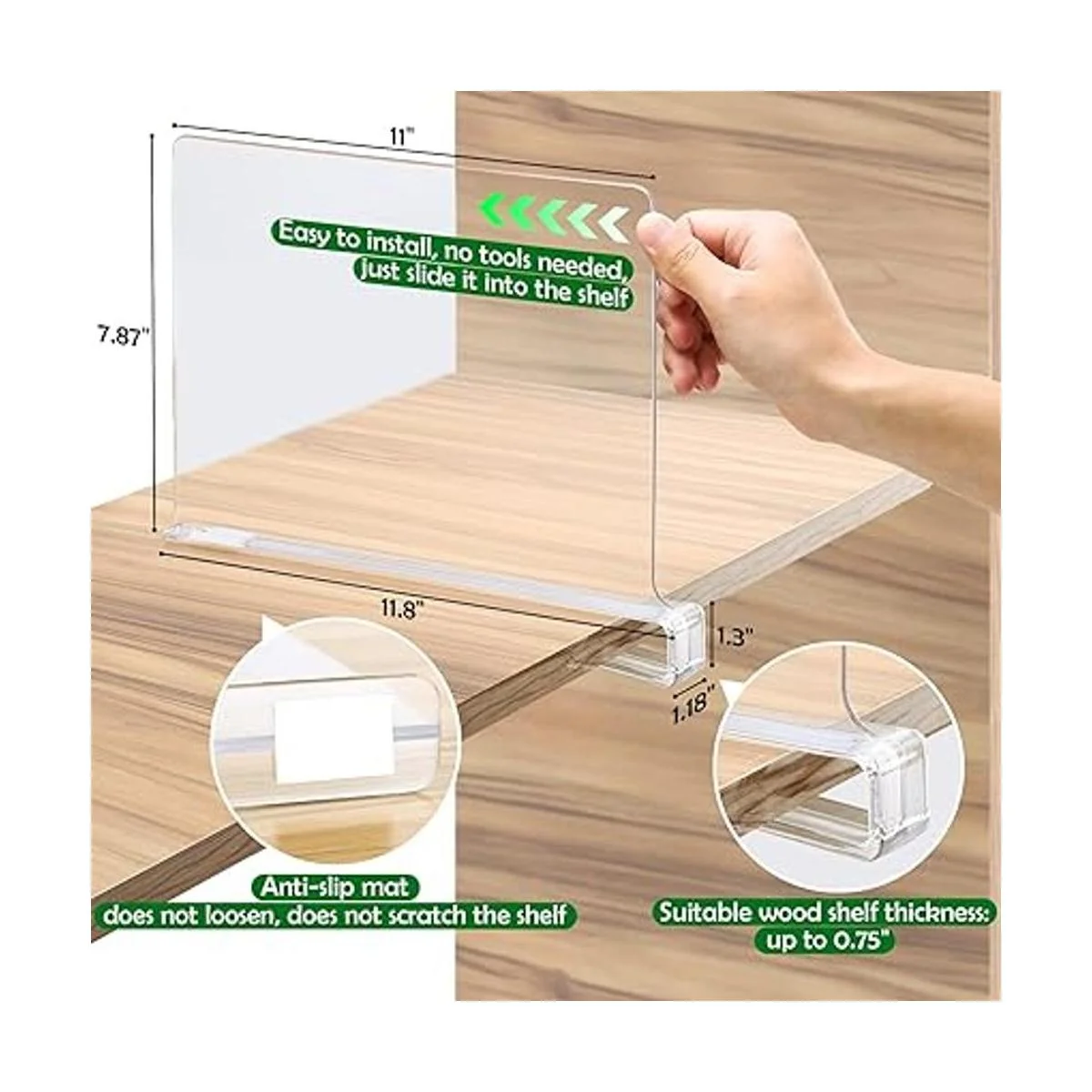 Fácil de instalar: cada divisor de estante transparente mide 11.8 pulgadas de largo x 7.8 pulgadas de alto. La apertura del divisor se adapta hasta 0.75 pulgadas de grosor exceder este grosor puede causar grietas. Los separadores acrílicos para armario son fáciles de instalar. Simplemente desliza los separadores en tu estante y permanecen en su lugar sin herramientas ni accesorios de montaje. El diseño de clips ajustables se puede mover o quitar fácilmente mientras se organiza. La parte inferior del divisor de estante del armario tiene una alfombrilla antideslizante negra que no raya tus estantes al deslizarse.