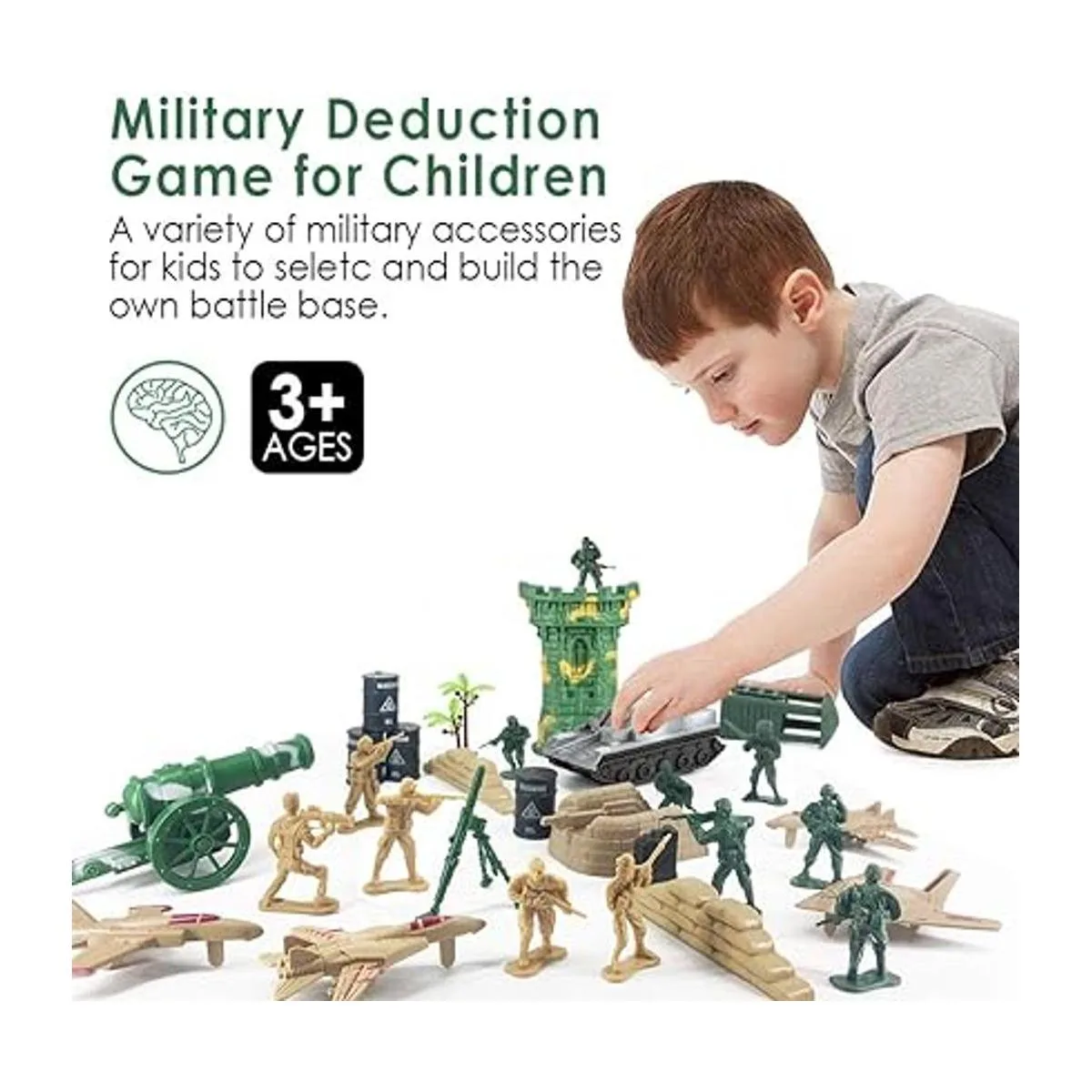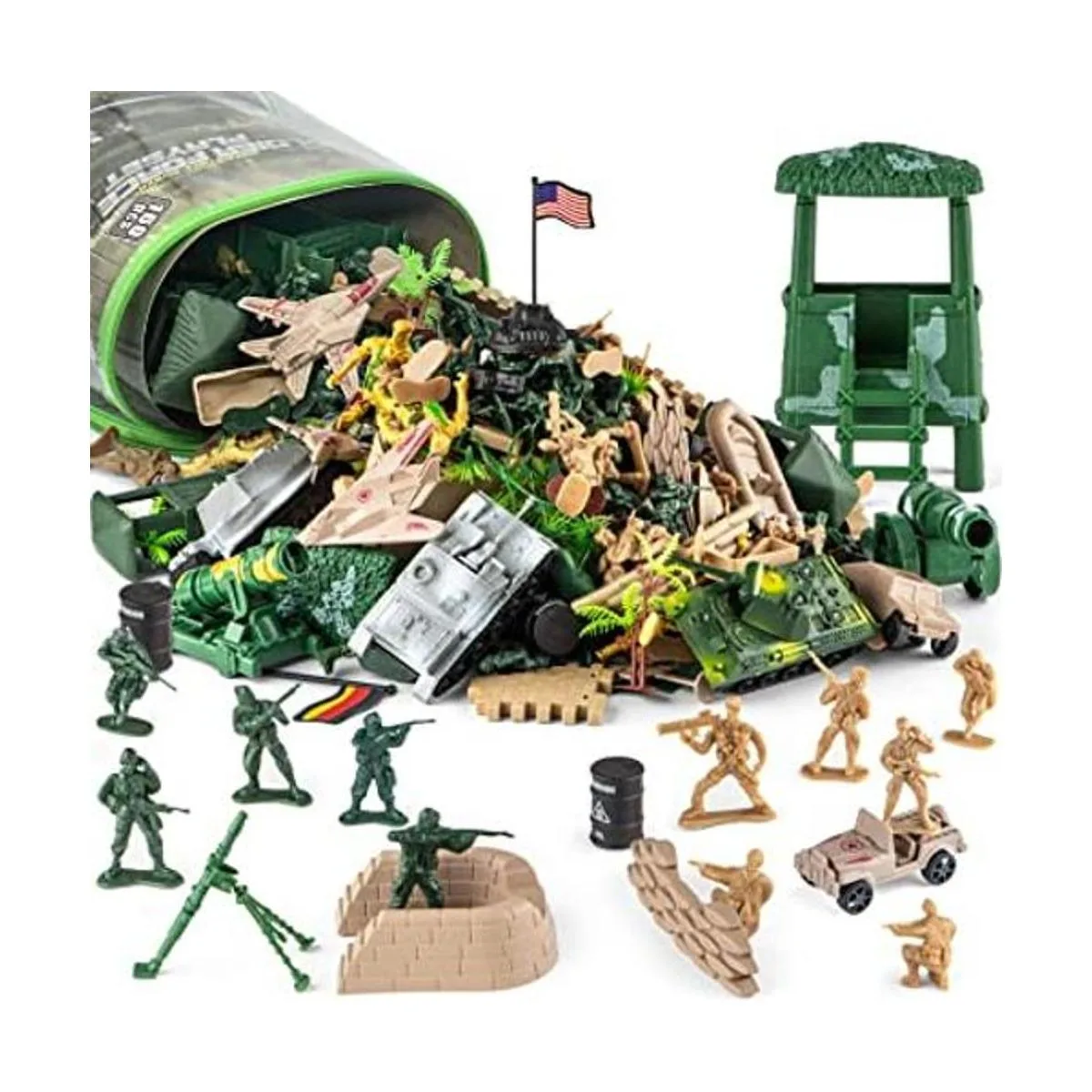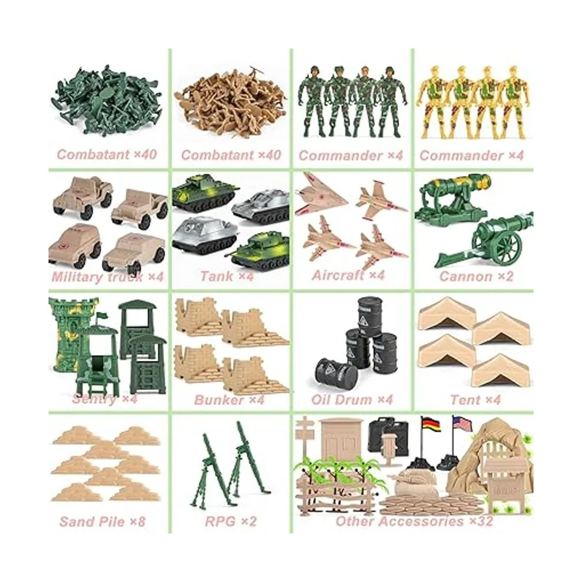 Juego de juguetes para hombre del ejército de gran valor: contiene 160 piezas de elementos de campo de batalla, incluyendo figuras de soldado comandante y combatiente de dos campamentos y otros equipos de campo de batalla aviones de combate, helicópteros, tanques, camiones, embarcaciones de aterrizaje, trípode de rifle, mortero, mortero, sacos de arena, piedras, búnker, centinela, trípode de gasolina, indicador y así sucesivamente, viene con bolsa de mano para almacenamiento.