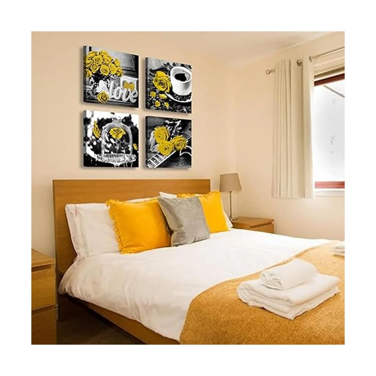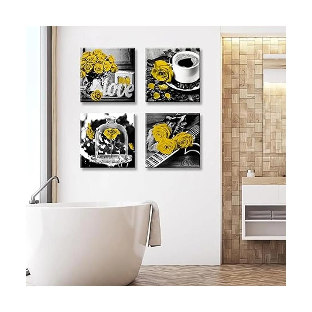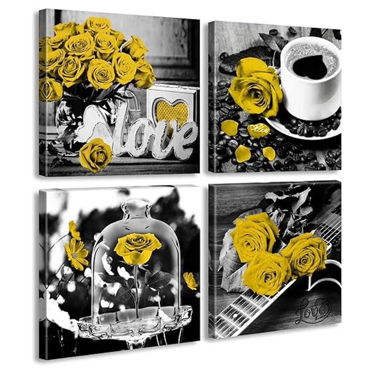 DJSYLIFE Decoración de rosas amarillas para sala de estar, arte de pared, 4 piezas, decoración de póster de flores, arte para colgar, pintura de 12 pulgadas de ancho x 12 pulgadas de alto x 4 pulgadas