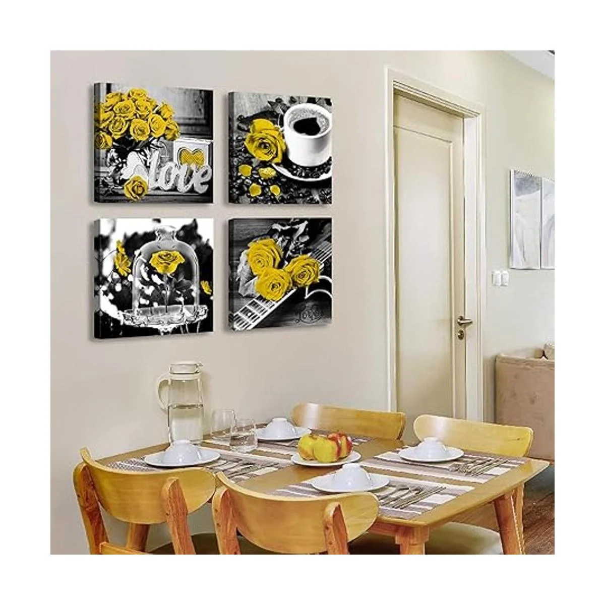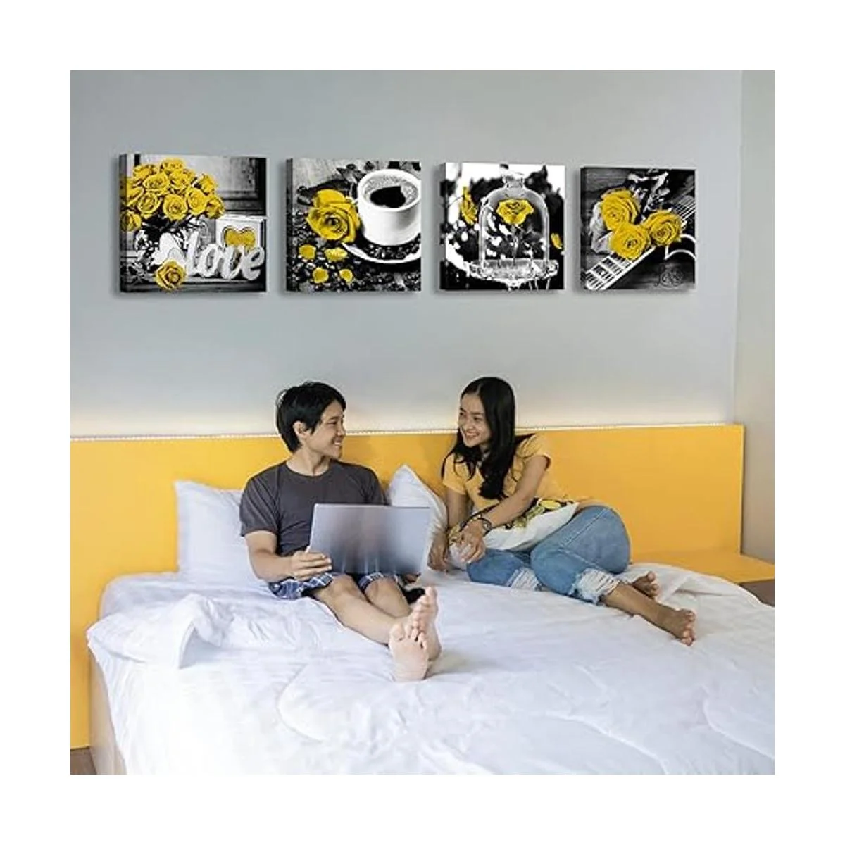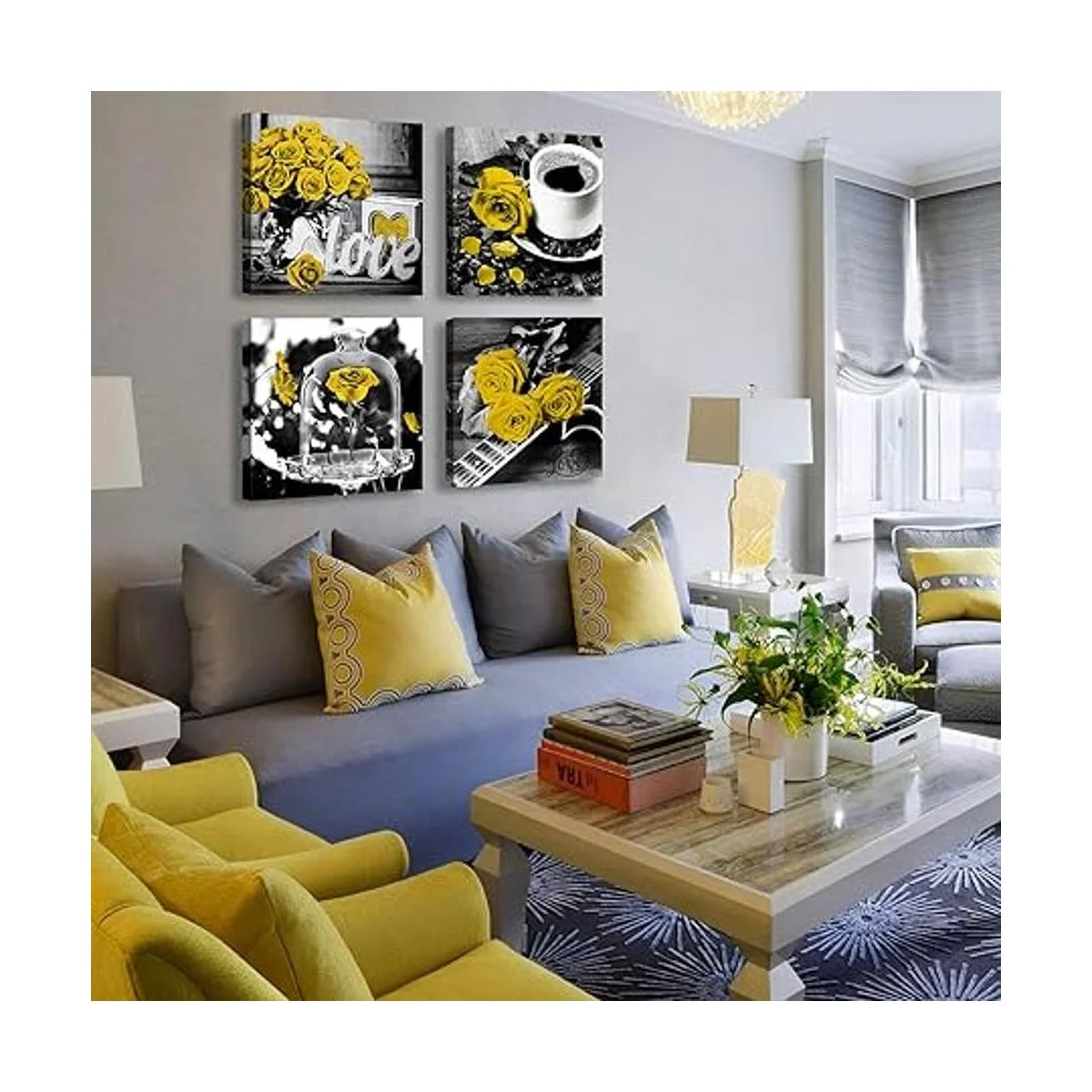 DJSYLIFE Decoración de rosas amarillas para sala de estar, arte de pared, 4 piezas, decoración de póster de flores, arte para colgar, pintura de 12 pulgadas de ancho x 12 pulgadas de alto x 4 pulgadas