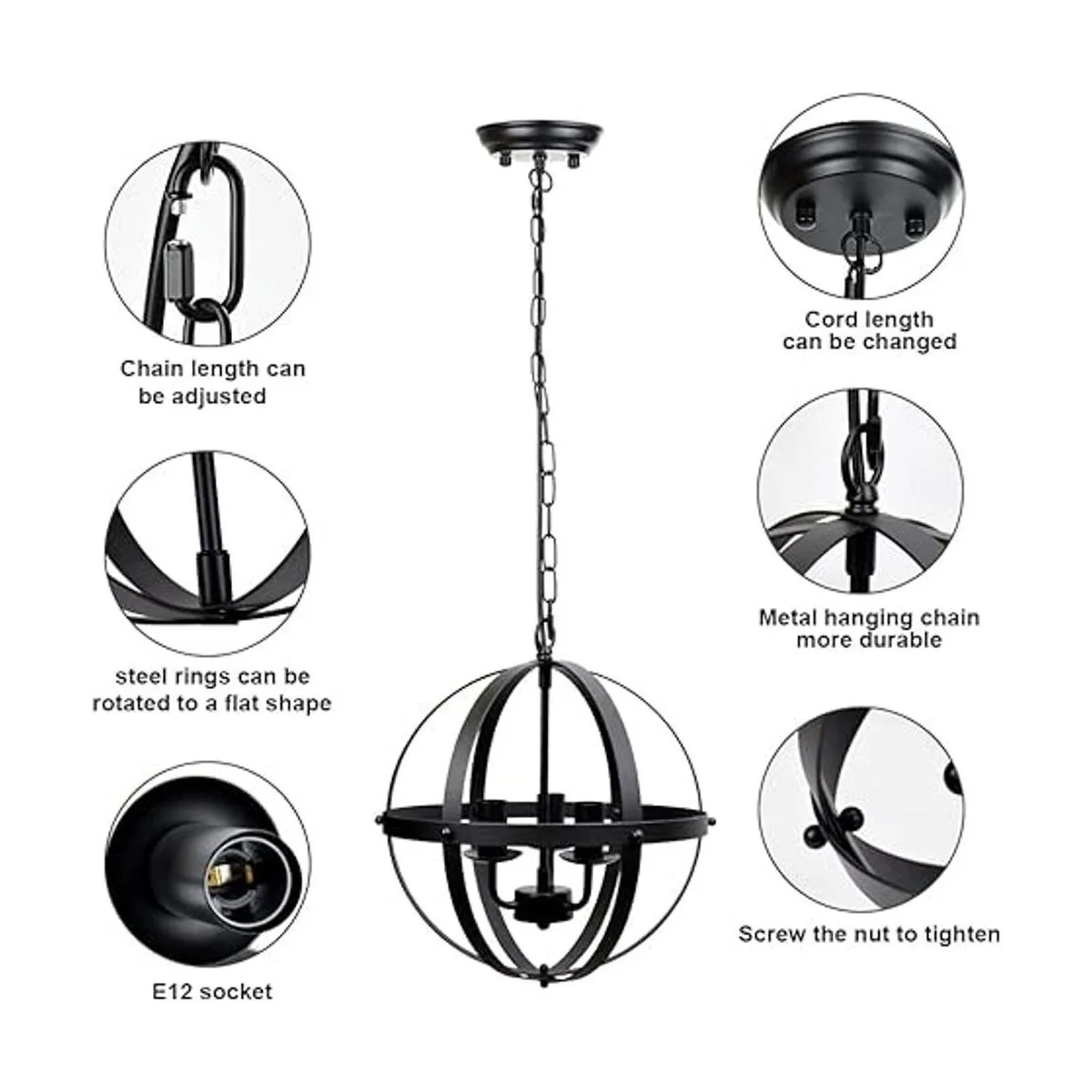 Cadena ajustable: equipada con cadena de 45.3 in y cuerda; la longitud se puede ajustar de acuerdo a tus preferencias y diseño. Ideal para diferentes áreas, incluyendo el comedor, sala de estar, cocina, baño, entrada, oficina, vestíbulo, dormitorio, pasillo, bar o entrada.