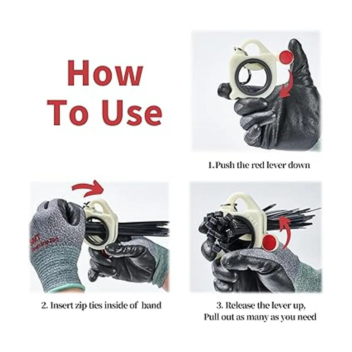 Eficiencia: la banda de cierre ayuda a trabajar de forma más eficaz. Sujeta un paquete de bridas para cables, por lo que se pueden transportar muchas bridas. Además, la corbata de cremallera se puede sacar pieza por pieza. El organizador de bridas de alambre ayuda a ahorrar tiempo de trabajo y hacer el trabajo más fácil. Incluso la banda de cremallera mantiene las bridas de cremallera resistentes extra apretadas.