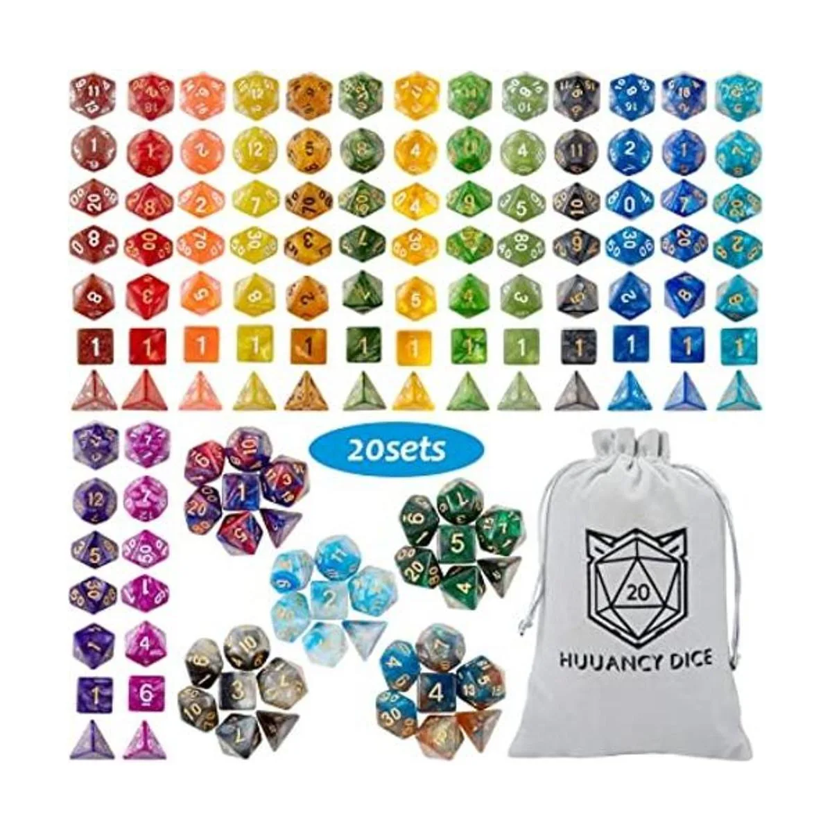 DND Juego de dados 140 piezas, dados poliédricos Huuancy para mazmorras y dragones DND RPG MTG juegos de mesa con 1 bolsa de franela grande, 20 colores