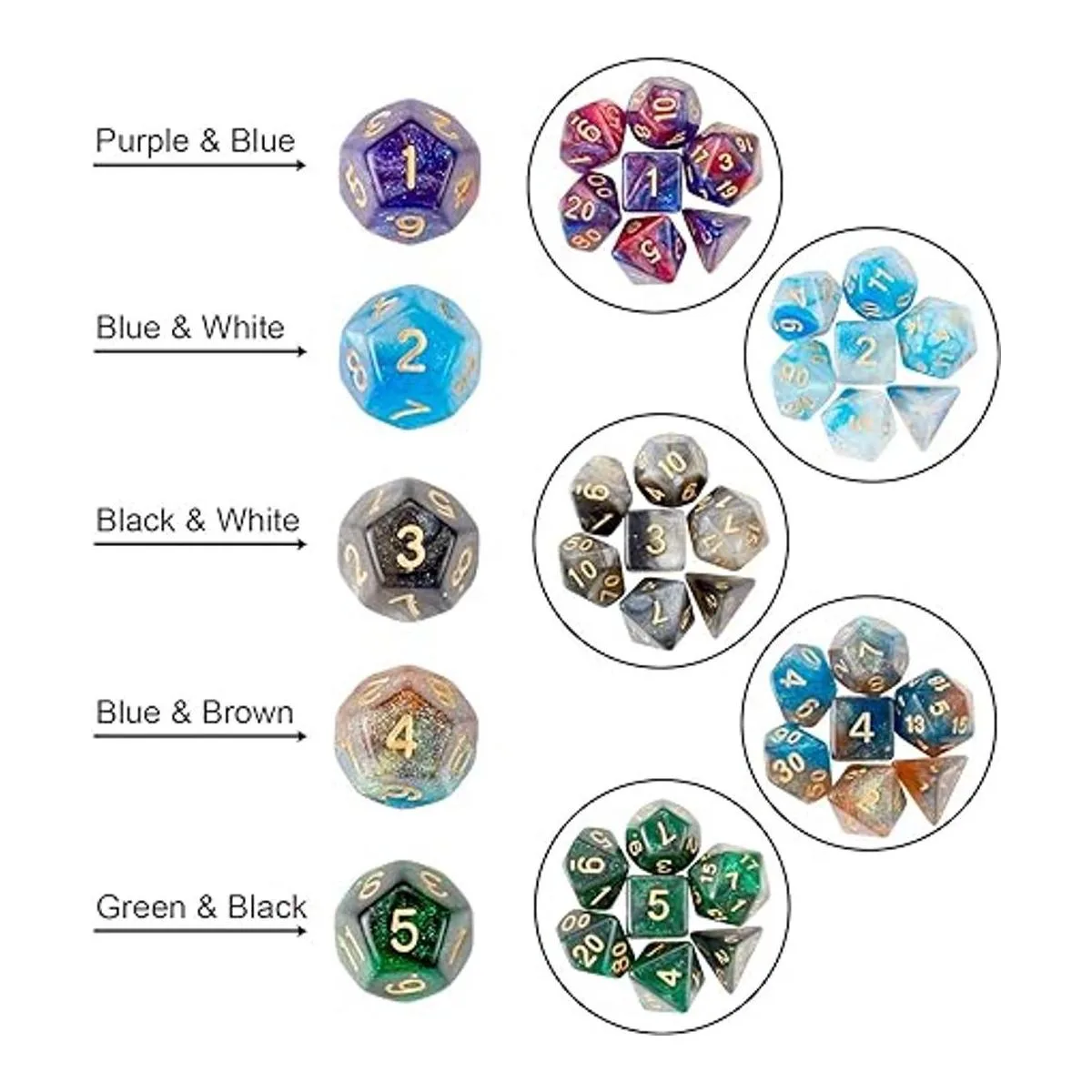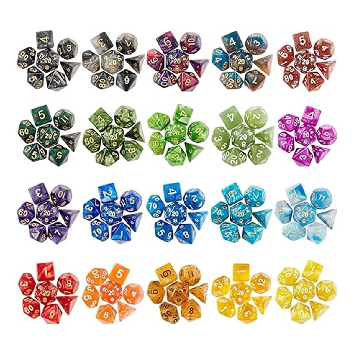 20 colores: cada grupo de dados DND contiene 1 dados d4, 1 dados d6, 1 dados d8, 2 dados d10 09 y 0090, 1 dados d12, 1 dados d20. Hay 140 en total. Viene con una gran bolsa de dados, por lo que no te preocupes por perder los dados.