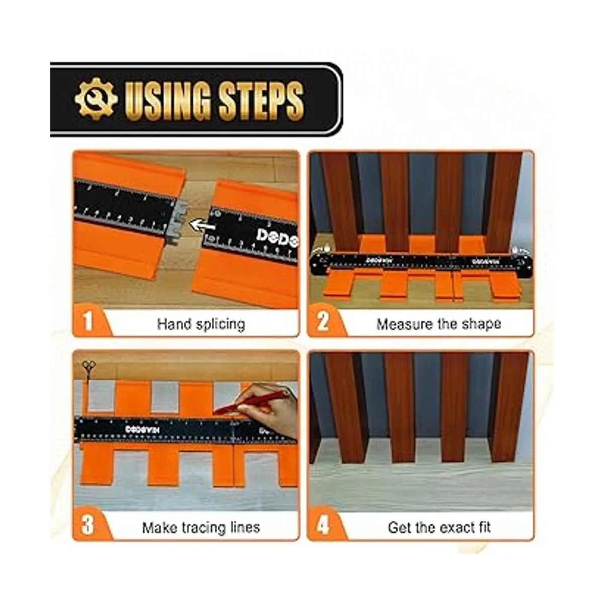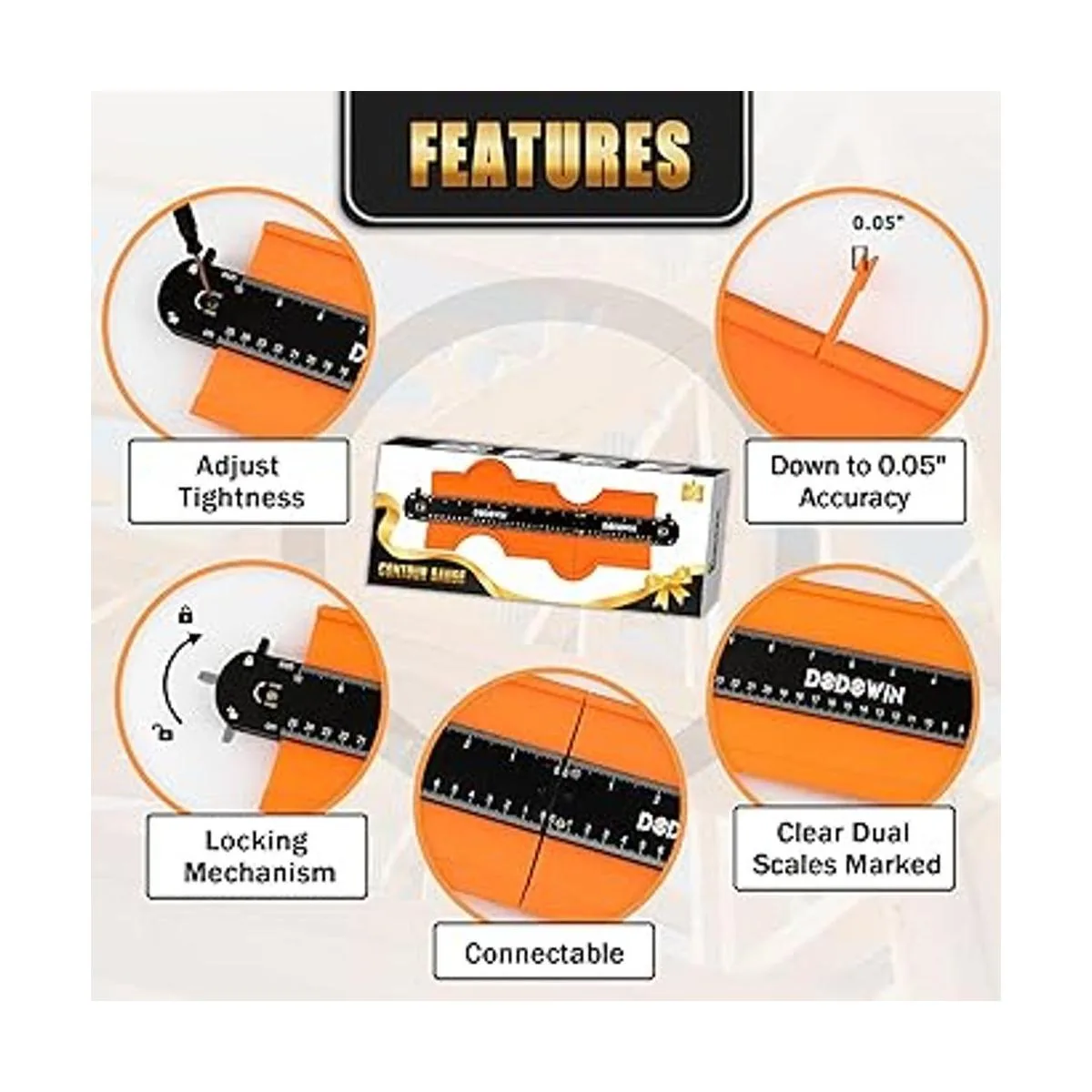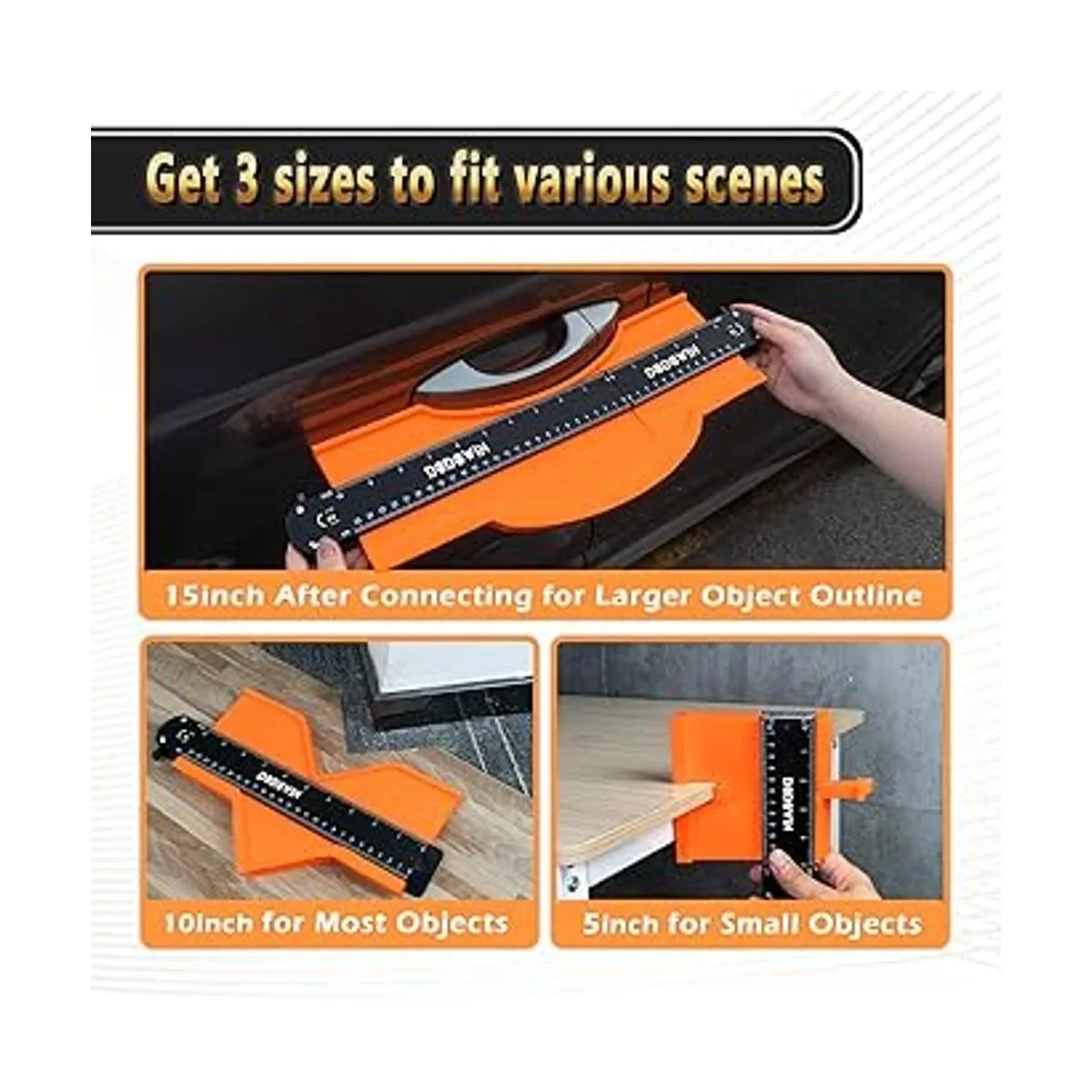 Medidor de contorno conectable DODOWIN Qué tiene de especial este medidor de contorno Puedes conectar los 5 y 10 pulgadas para hacer un calibre de 15 pulgadas. Se puede utilizar en combinación o solo. 5 pulgadas adecuado para copia de esquina, 10 pulgadas se adapta a medir proyectos más largos, 15 pulgadas después de la conexión, lo que puede copiar contornos de objetos más grandes. Las herramientas de medición de tres tamaños pueden ayudar a copiar diferentes formas.
