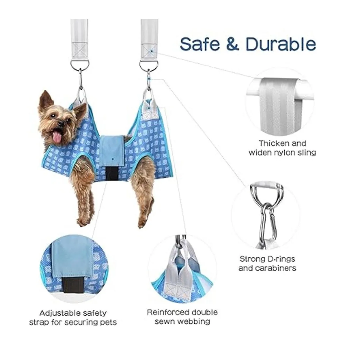 Sistema de colgar seguro y duradero: este arnés de aseo para perros adopta correas reforzadas de doble costura, eslingas de nailon gruesas y anchas y mosquetones de acero inoxidable, que son resistentes, resistentes y lo suficientemente estables como para colgar a tus mascotas de forma segura. Además, se añade una correa de seguridad ajustable para asegurar a tus mascotas, evitar que se caigan o se escapen.