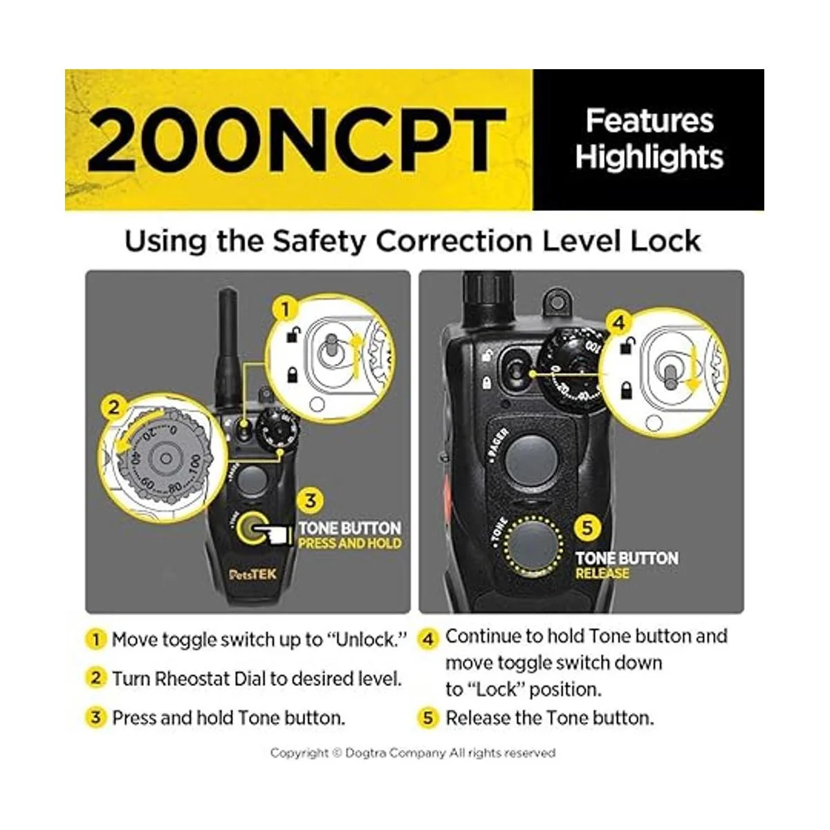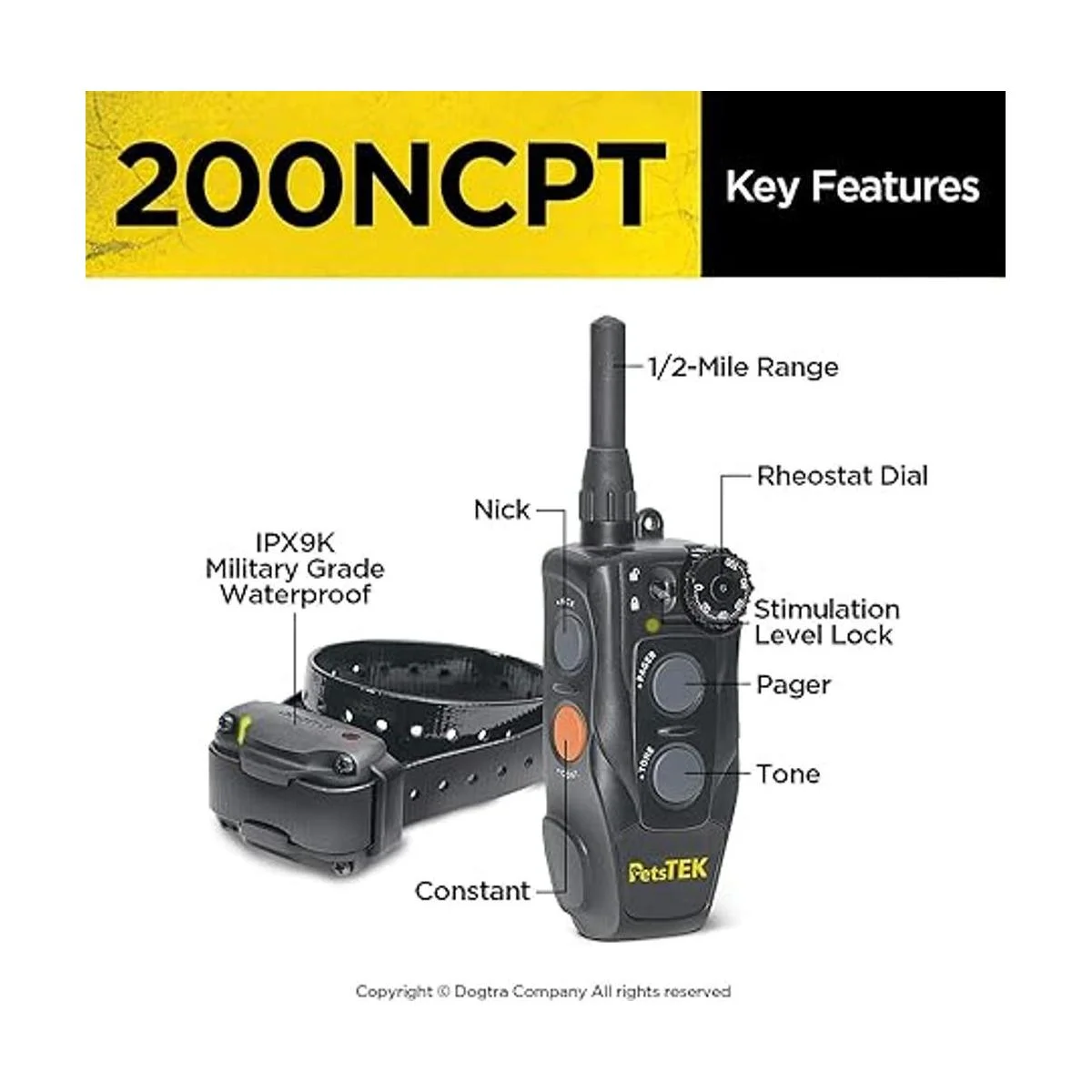 Dogtra 200NCPT Collar electrónico de entrenamiento para perros con control remoto para perros pequeños a perros grandes, rango de 2640 pies, vibración, tono, 100 niveles de estimulación, bloqueo de seguridad, impermeable, recargable, edición PetsTEK