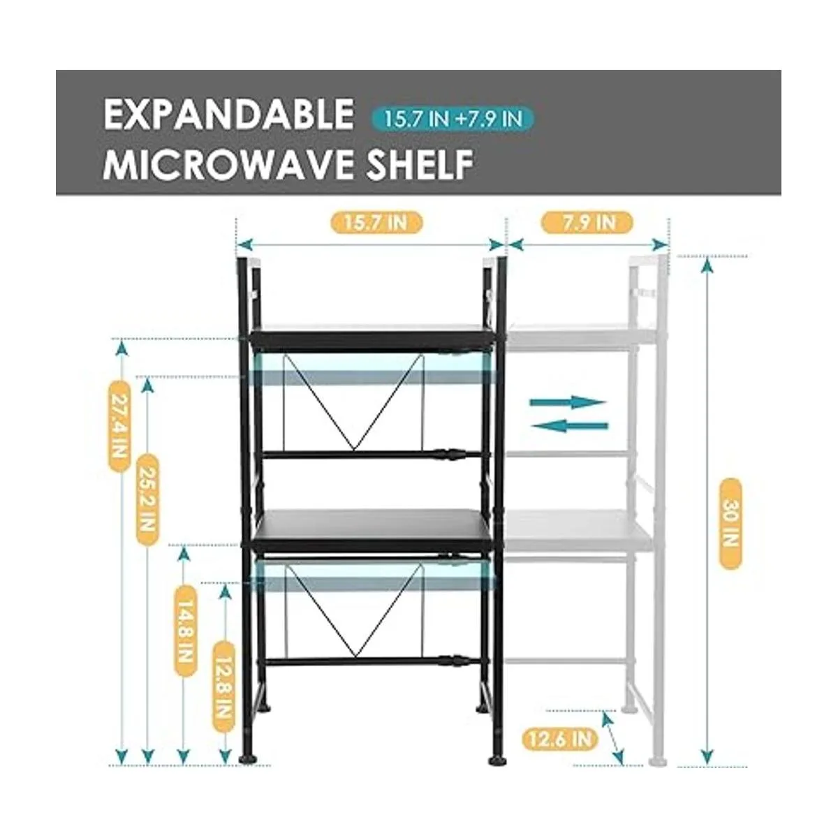 Soporte expandible para encimera de microondas: la longitud de este soporte de estante de microondas se puede ajustar de 15.7 in a 23.6 in de acuerdo a tus necesidades. Puedes ajustar el tamaño para almacenar un horno microondas y otros utensilios de cocina para ayudarte a ahorrar más espacio en la cocina. Nota: los accesorios que proporcionamos están completados, consulta la imagen 4 para ver las dimensiones de los tornillos