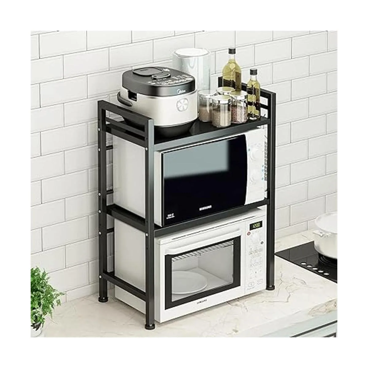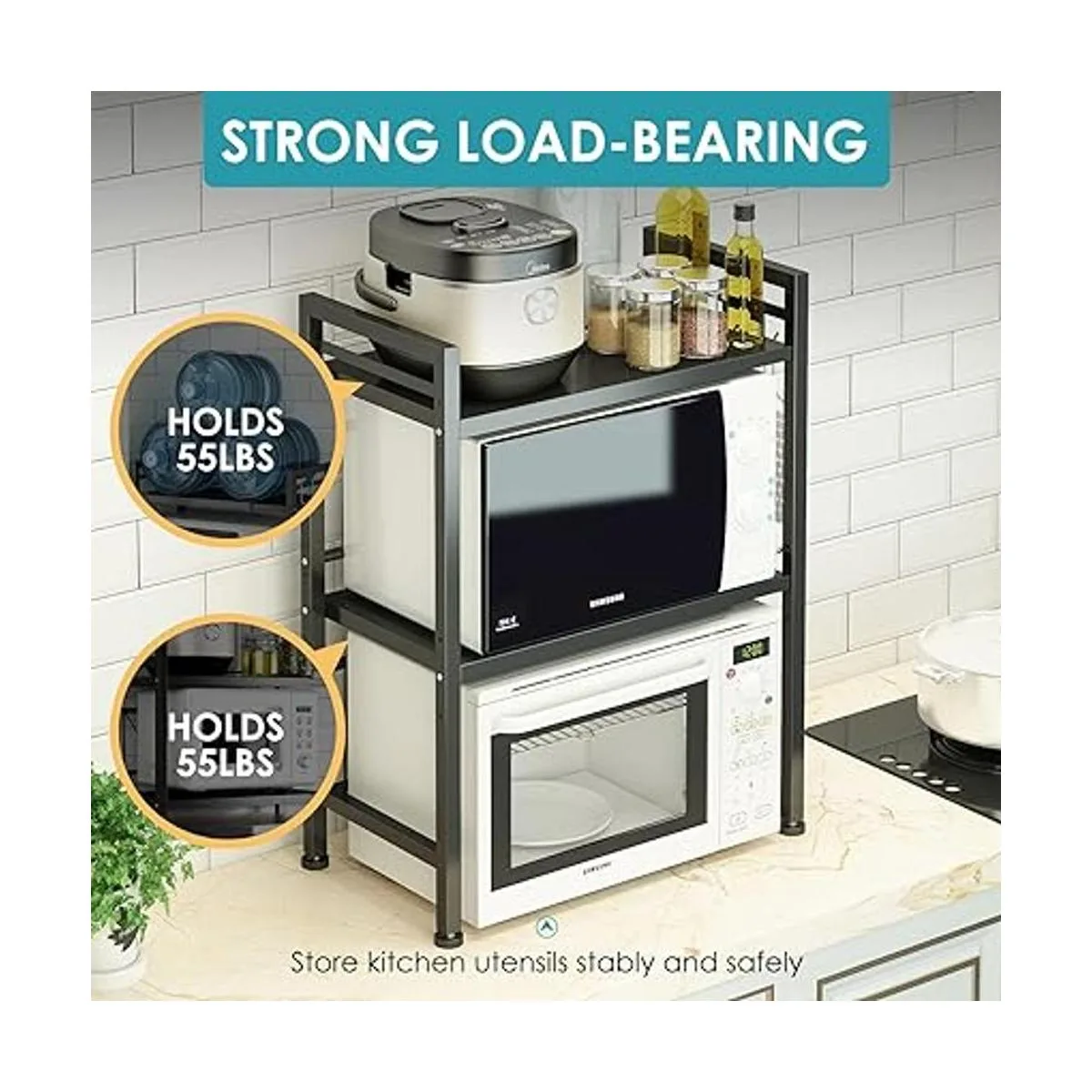 Construcción fuerte y resistente: el estante para microondas DOLALIKE está hecho de acero al carbono, que cada nivel puede soportar hasta 55 libras, total puede soportar hasta 110 libras, resistente y duradero, puede almacenar microondas y otros artículos de cocina como botellas, latas, cuencos, platos, sartenes, ollas de sopa, etc. Es un bonito y perfecto suministro de cocina.