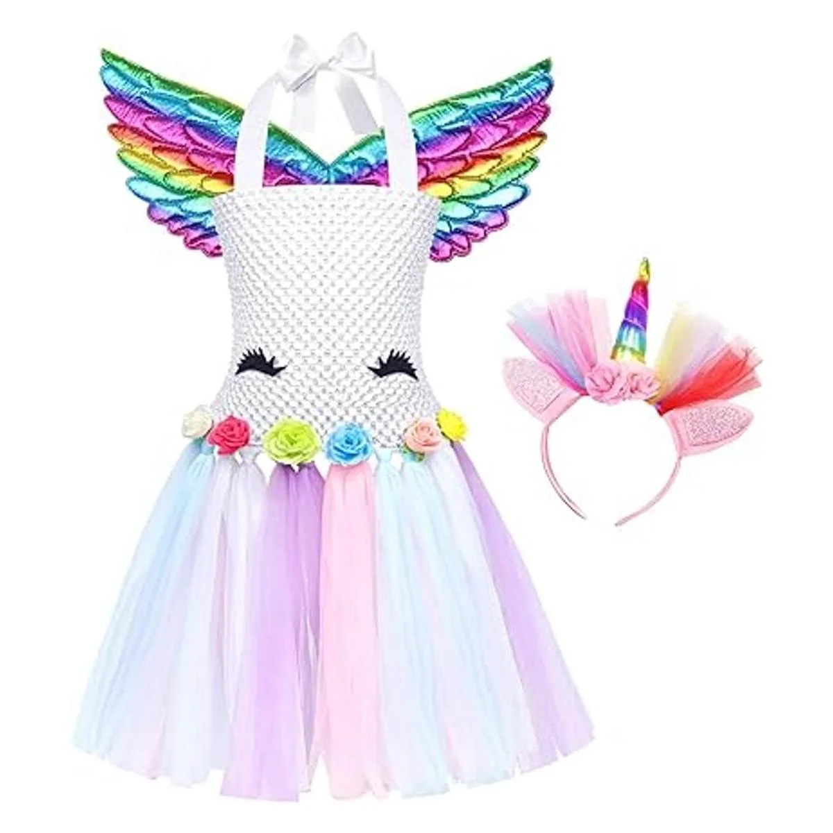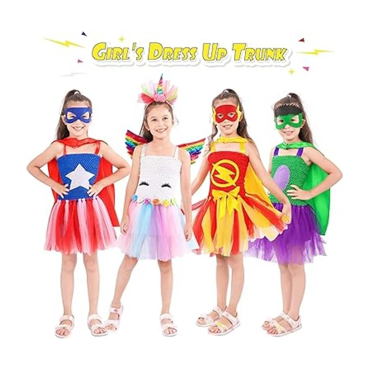 Exquisito traje de baño para niñas: 12 disfraces para niñas incluyen: cuatro faldas, tres capas, tres vendas, una diadema de unicornio y unas alas coloridas. Toda la ropa y accesorios de vestir se almacenan perfectamente en una bonita caja de almacenamiento reutilizable