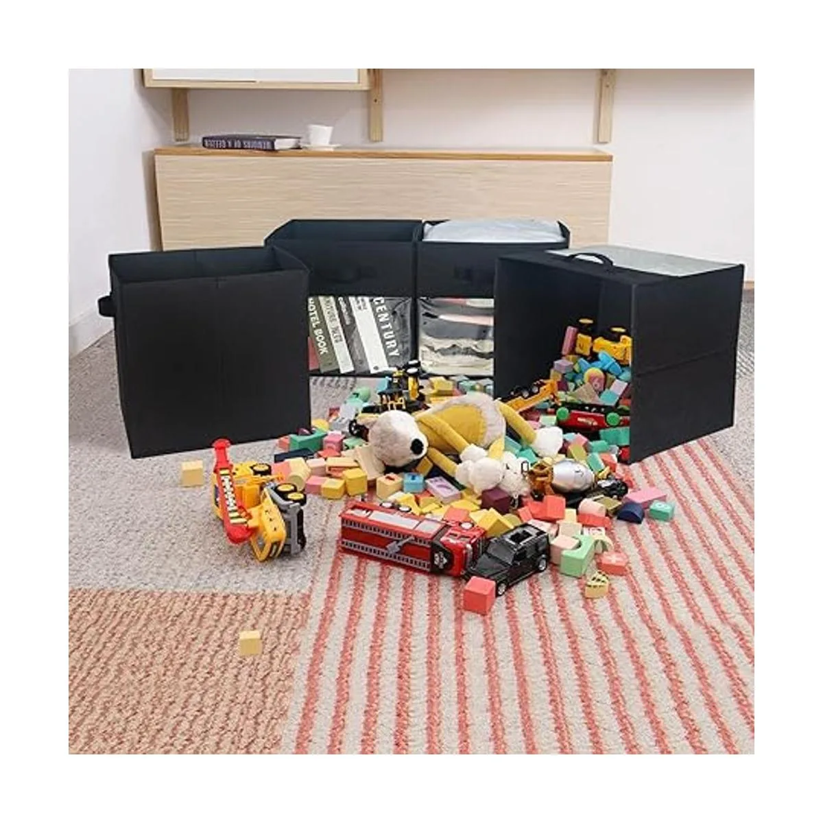 Fácil de montar en segundos: los lados de cartón y el inserto inferior extraíble dan a estos contenedores de almacenamiento plegables, lo que les permite mantenerse de pie por sí solos sin estar completamente llenos. Y la construcción reforzada garantiza un uso duradero.
