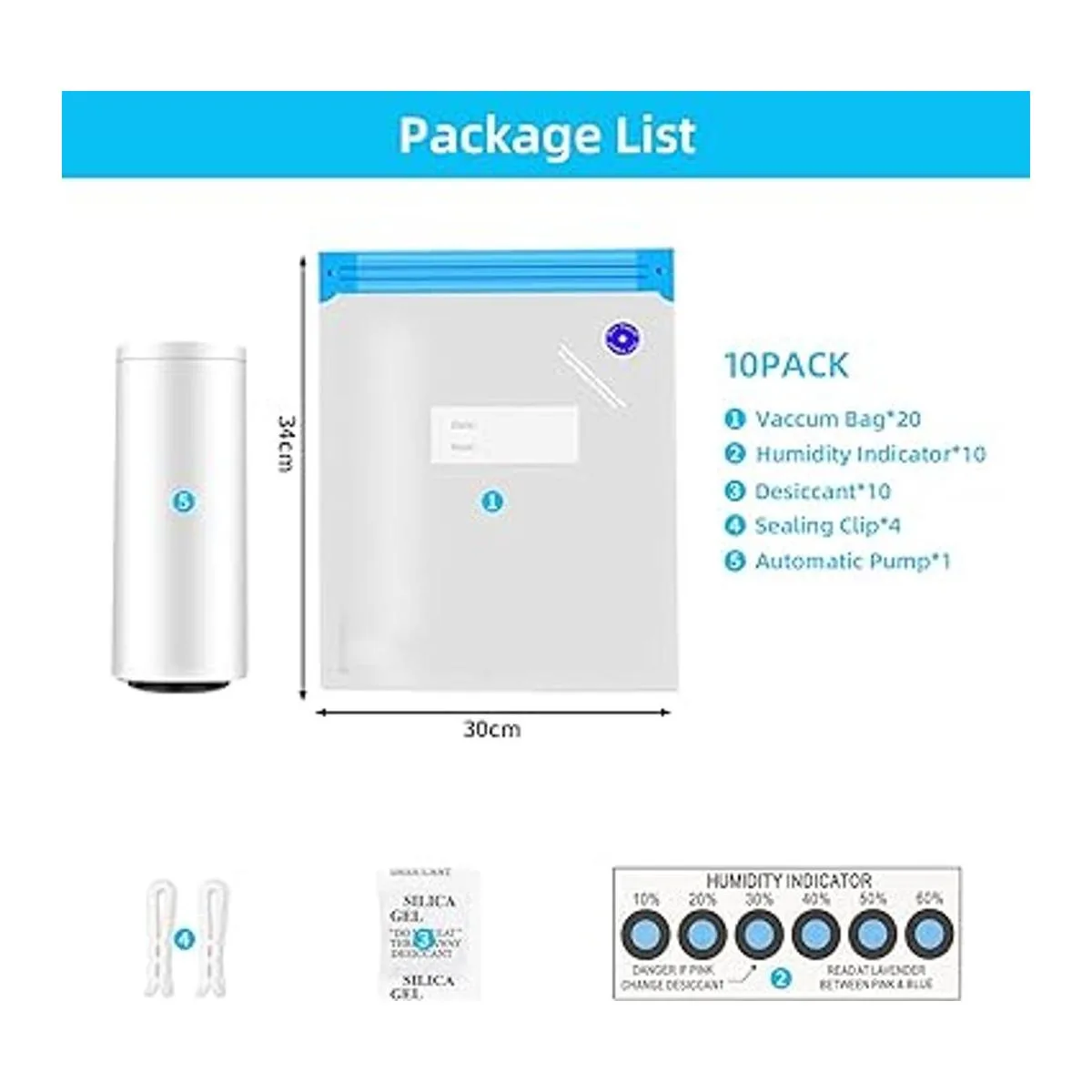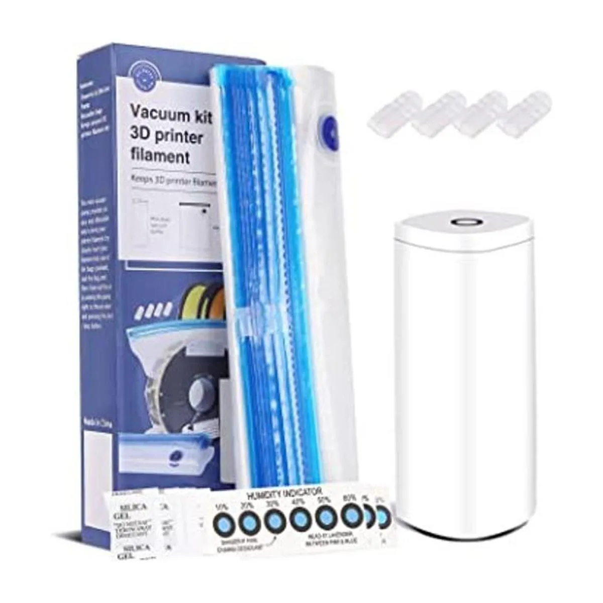 Contenido del paquete El kit de vacío incluye 10 bolsas de vacío 11.8 x 13.4 pulgadas para carrete de 2.2 lbs, 1 bomba de vacío automática, 4 clips de sellado, 10 desecantes, 10 indicadores de humedad, embalaje al vacío con desecante, deja que tus consumibles se mantengan secos y a prueba de polvo, lo que hace que la impresión de consumibles sea más suave y estable.