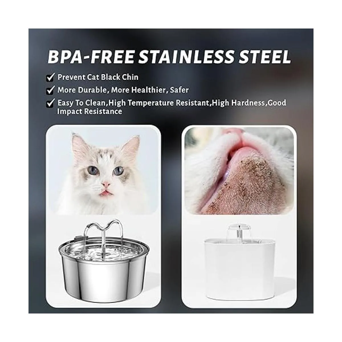 Fuente de acero inoxidable 304 para gatos: la fuente de agua para gatos está hecha de acero inoxidable de alta calidad, que es saludable e higiénico, libre de BPA, seguro y fácil de limpiar, puede soportar años de uso diario, es apto para lavavajillas y tiene una excelente resistencia a la corrosión. El material de acero inoxidable es naturalmente agradable a la piel y agradable para tu gato, especialmente aquellos con acné de barbilla u otros problemas de piel sensible.