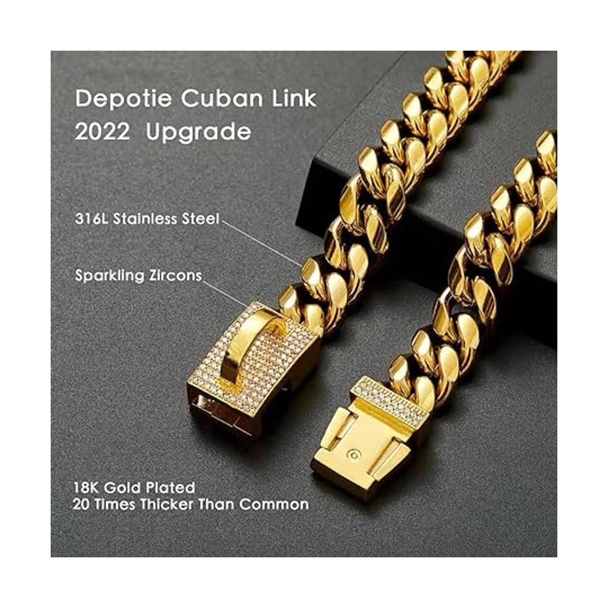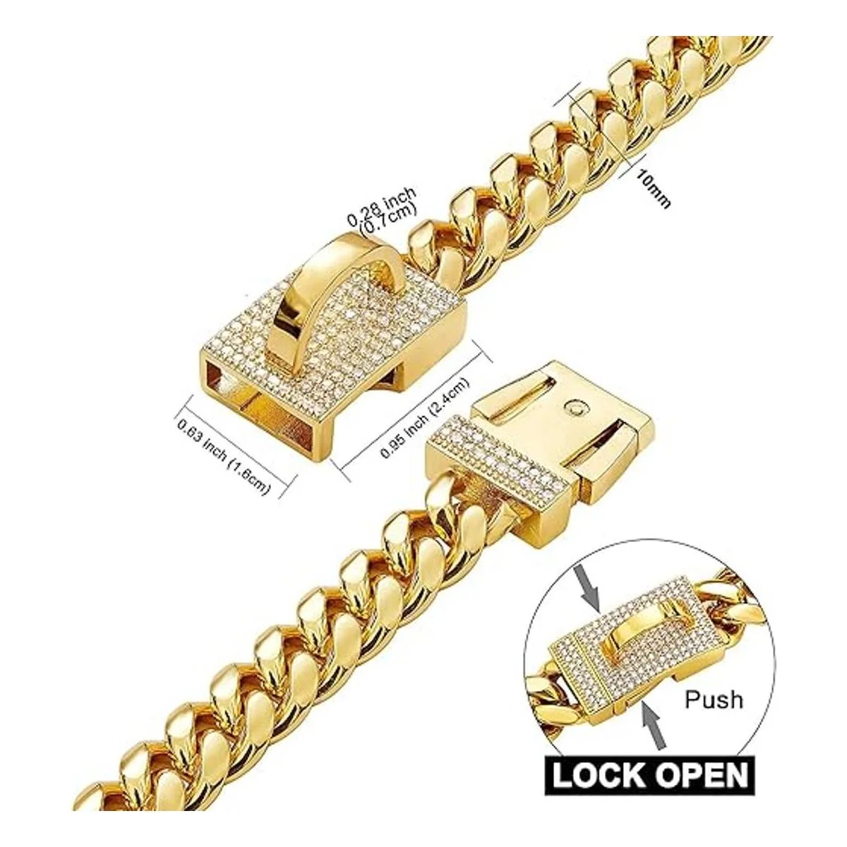 Material fuerte y duradero: todo el cuerpo de la cadena está hecho de acero inoxidable 316L y chapado en oro de 18 quilates que es 20 veces más grueso que la mayoría de collares de mascotas similares en el mercado. En comparación con el acero inoxidable 304 común, el acero inoxidable 316L tiene una mejor resistencia a la corrosión y resistencia, es lo suficientemente fuerte como para soportar una fuerza de tracción de 700 libras, y es resistente al agua, a prueba de mordeduras.