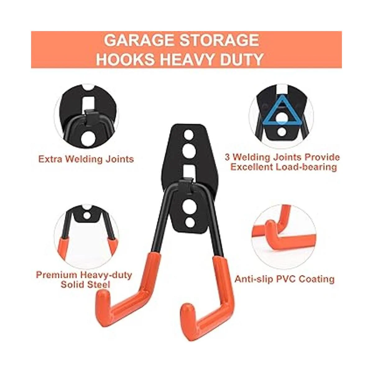 Con más juntas de soldadura y seguridad Estamos comprometidos a maximizar la seguridad y la capacidad de las herramientas organizativas. A diferencia de la mayoría de los ganchos de soldadura directa en el mercado, el gancho extra fuerte en la placa de fijación es una gran ventaja para estos innovadores ganchos de garaje para sujetar firmemente los ganchos de doble brazo antes de soldar, ofreciendo doble seguridad e incluso soportar un peso adicional de 10 libras sin preocuparse de que el panel trasero de acero se rompa o se caiga.