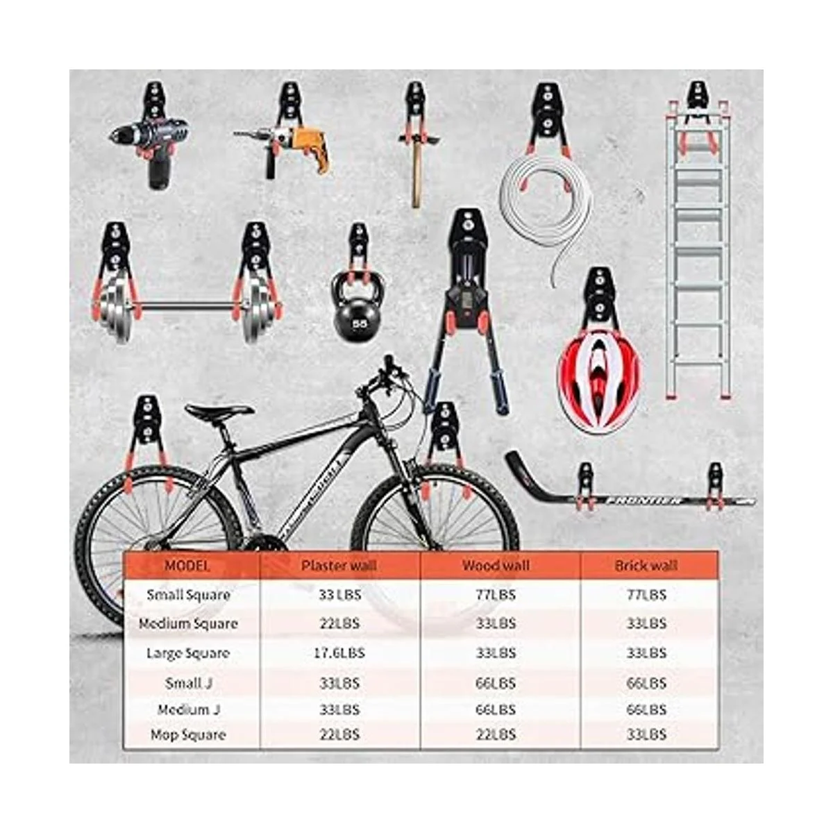 Ganchos extra para trapeadoras/escobas: el juego de ganchos de garaje viene en 16 piezas en 6 tamaños prácticos, incluyendo 2 ganchos cuadrados grandes, 3 ganchos cuadrados medianos, 5 ganchos cuadrados pequeños, 2 ganchos grandes J, 2 ganchos pequeños J y 2 ganchos S. Los ganchos adicionales en S almacenan herramientas como escobas o trapeadores. Esta organización de garaje puede colgar varios artículos, desde herramientas hasta equipos de jardín como escaleras, bicicletas, sillas plegables, cochecitos e incluso cortadoras de césped eléctricas ligeras.