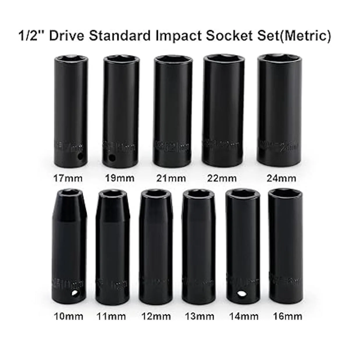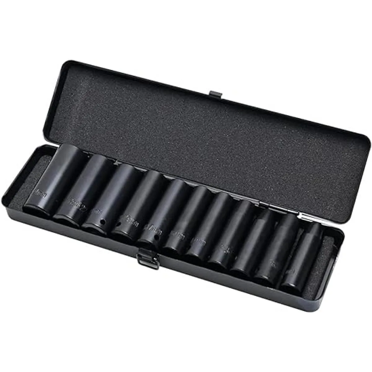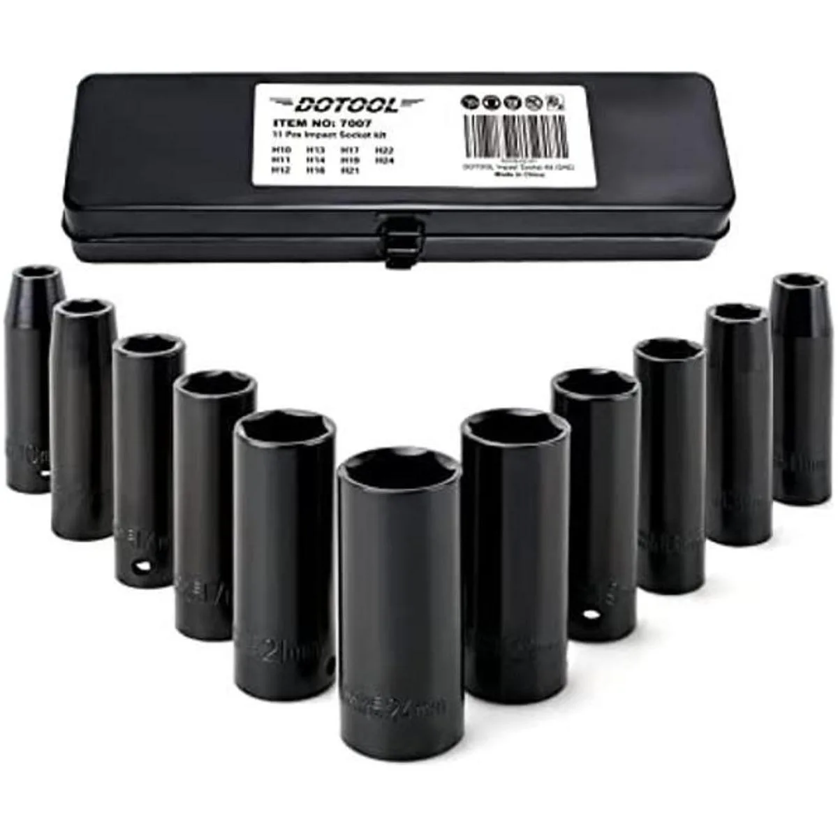 DOTOOL Juego de llaves de impacto de 12 pulgada, 11 piezas de unidad profunda de 6 puntos, caja de acero de hierro universal CrV, tamaños métricos 0.394 in a 0.945 in