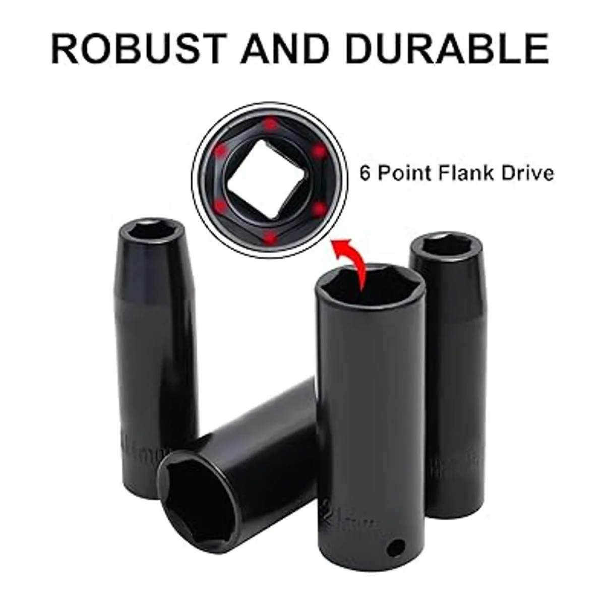 Uso flexible Construido para su uso con herramientas de impacto, estos 0.5 in. Conduce enchufes de impacto profundo sin esfuerzo la suspensión oxidada y los pernos de escape, retira rápidamente las tuercas pegadas y afloja los pernos de manivela con facilidad. Los enchufes de impacto transfieren eficazmente el par de torsión de llave de impacto al sujetador, aflojando las tuercas y pernos más difíciles.