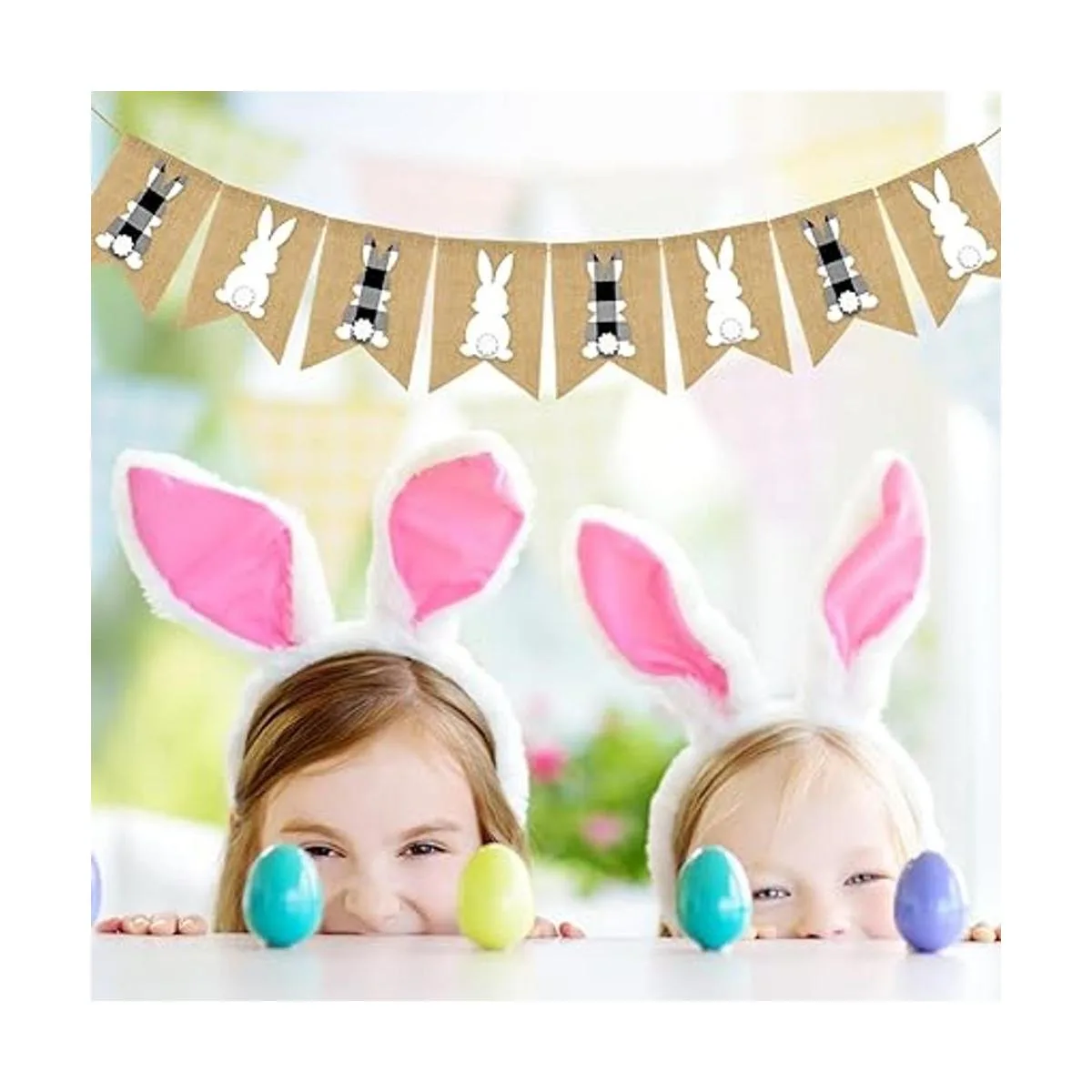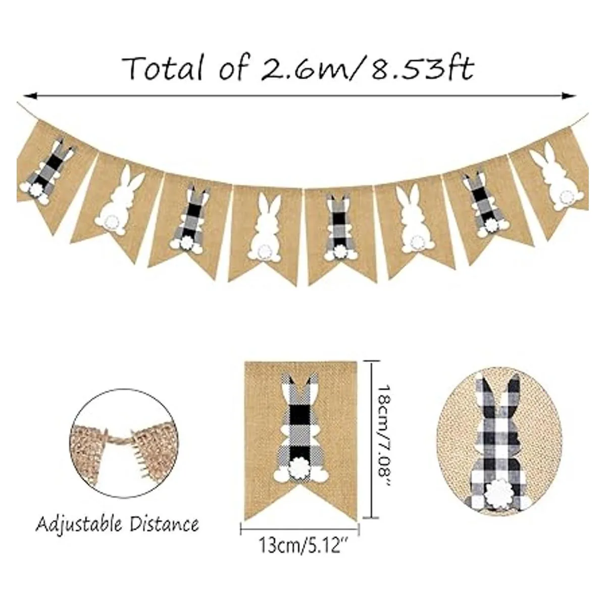Doumeny Bandera de arpillera a cuadros de Pascua con diseño de búfalo, conejo, yute, conejo blanco, guirnalda de banderines de Pascua para primavera, fiesta de Pascua, pancarta para chimenea, pared, puerta, decoración de fiesta