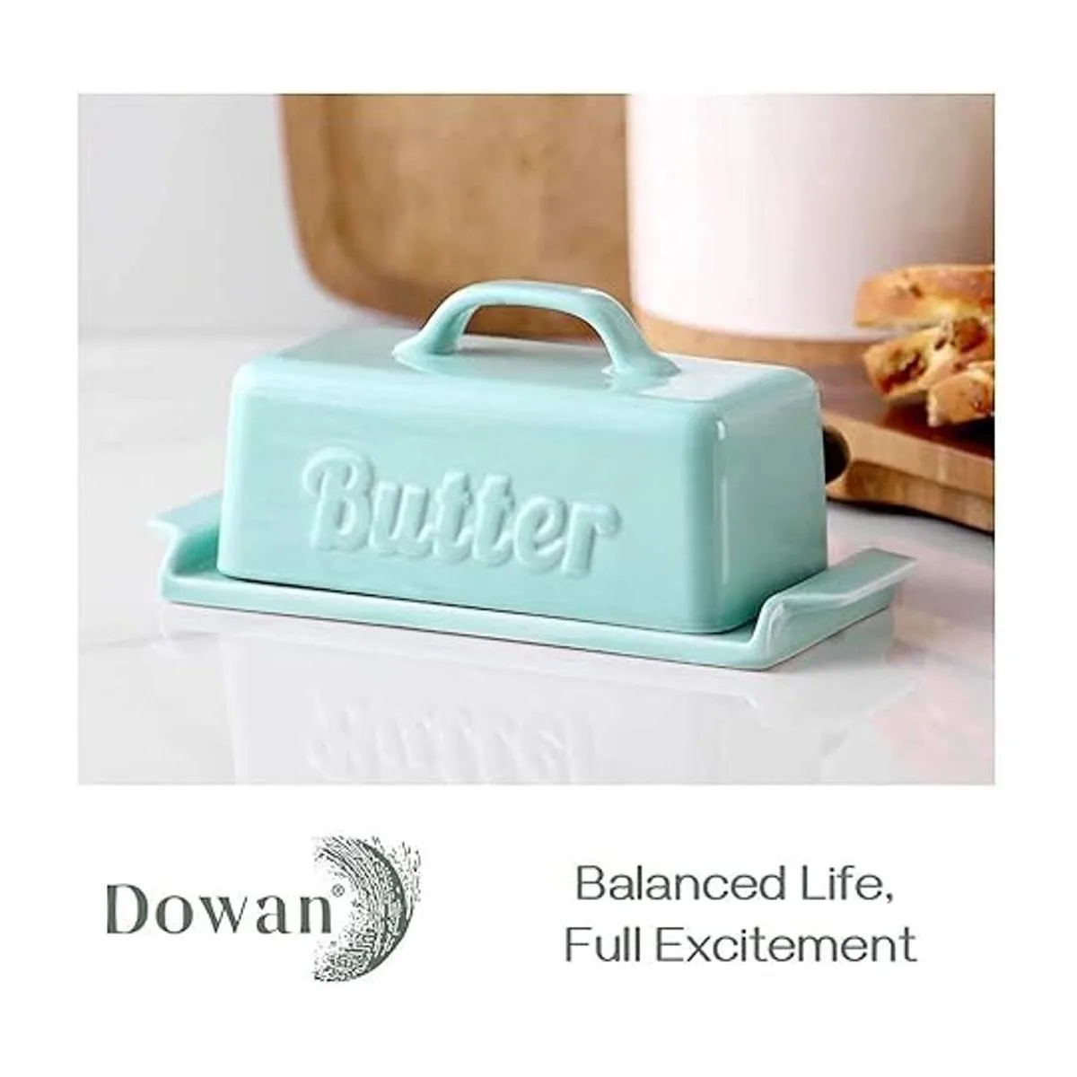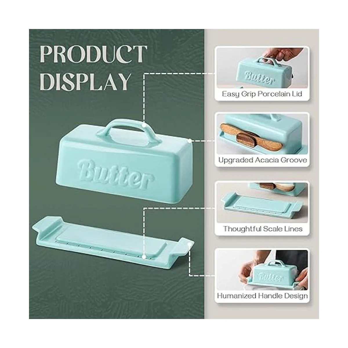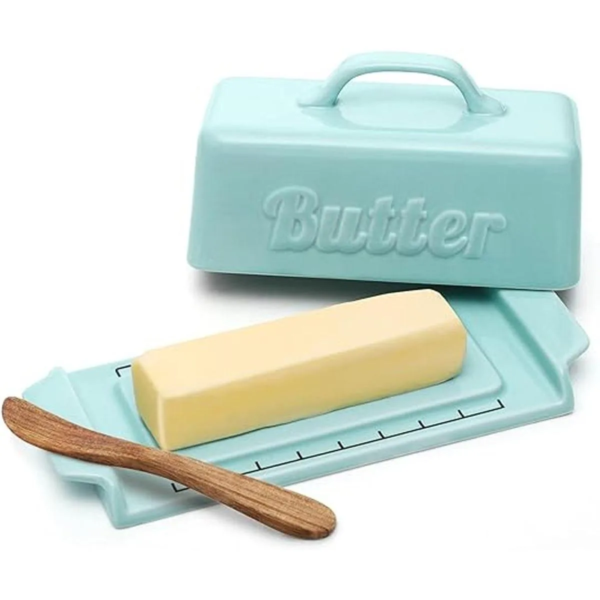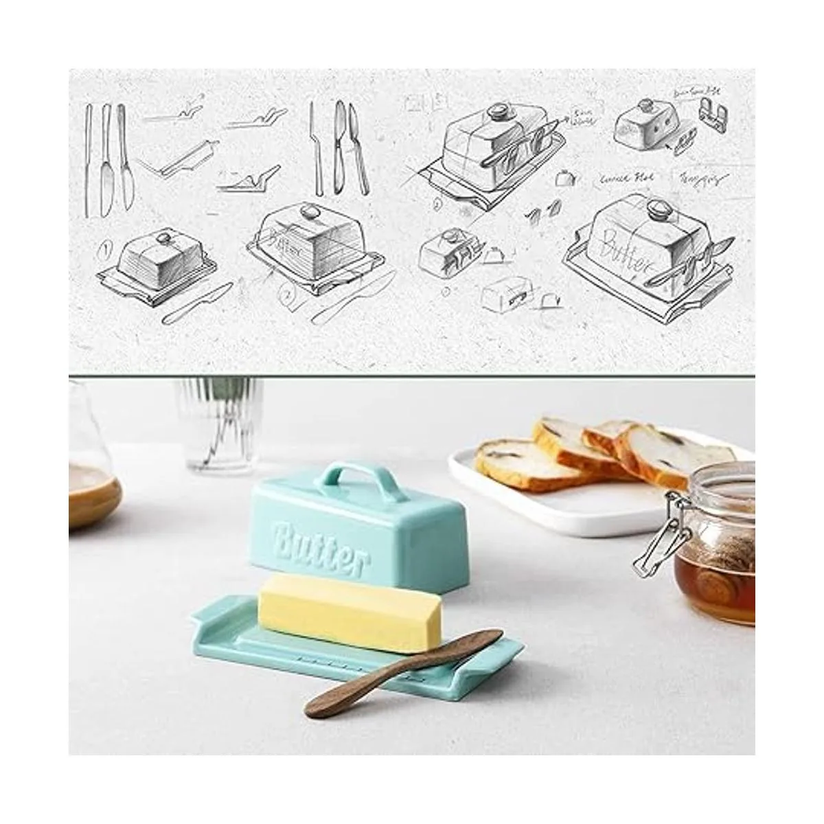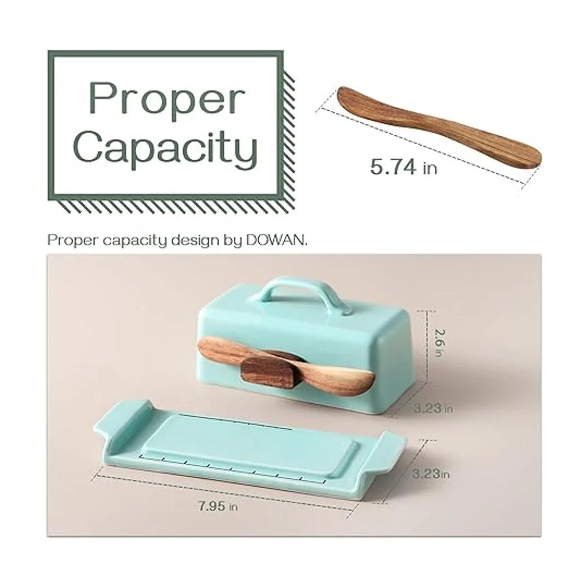 DOWAN Mantequilla con tapa y cuchillo, mantequilla con medidas de corte y mango de cuchillo humanizado para mantequilla de la costa este oeste, plato de mantequilla de cerámica con tapa para encimera, turquesa