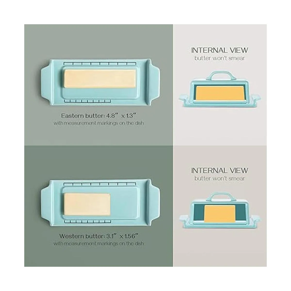Líneas de medición cuidadosas: nuestra mantequera con tapa y cuchillo viene con 2 tipos de líneas de medición de corte tanto para palos de mantequilla de la costa este como de la costa oeste, lo que te permite obtener la cantidad exacta de mantequilla al hornear o cocinar. Gran escala para mantequilla oriental, pequeña escala para occidental