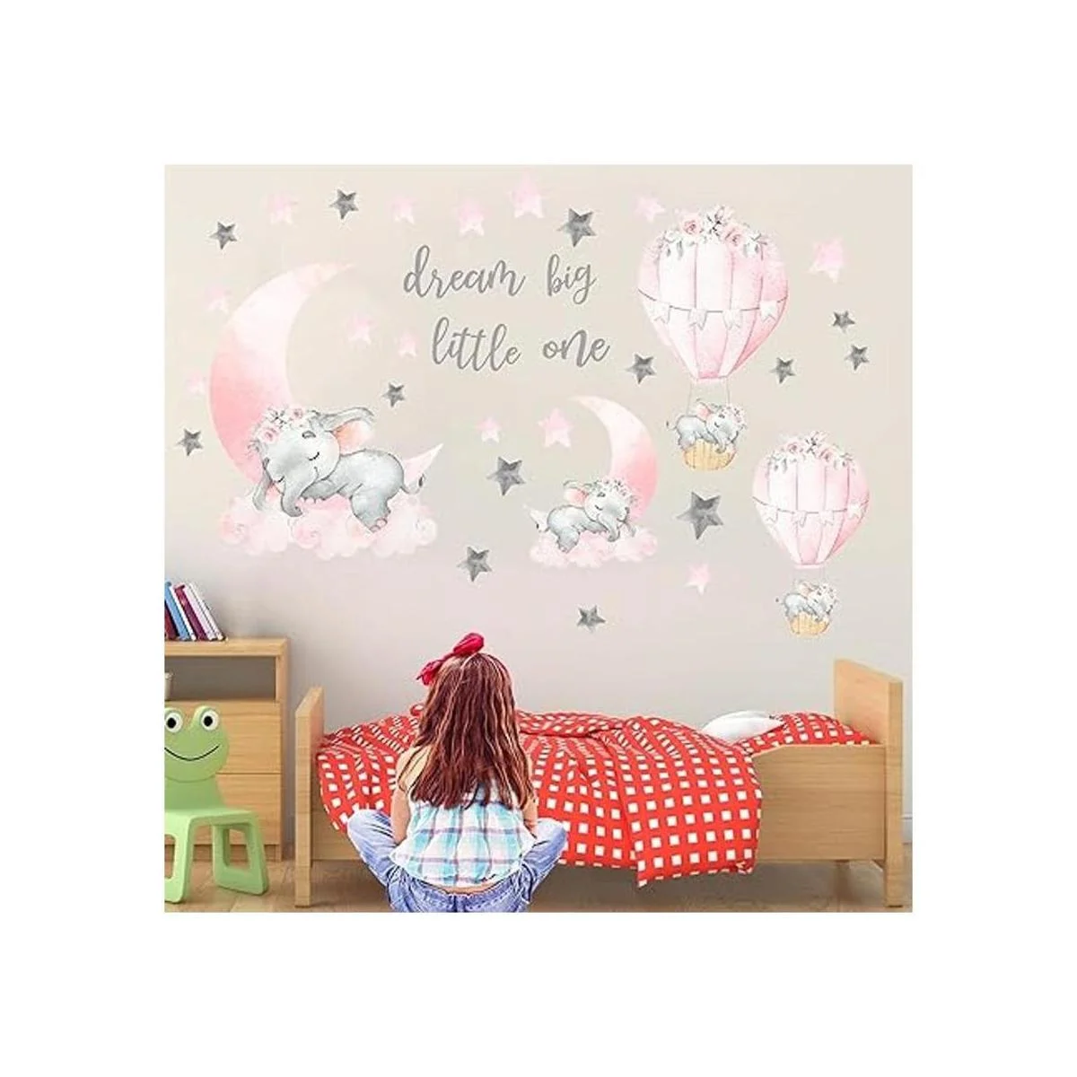 Dream Big Little One Calcomanías de pared de elefante, luna rosa, globo de aire caliente, estrellas grises, calcomanías de pared para habitación de niños, sala de estar, dormitorio, decoración del hogar