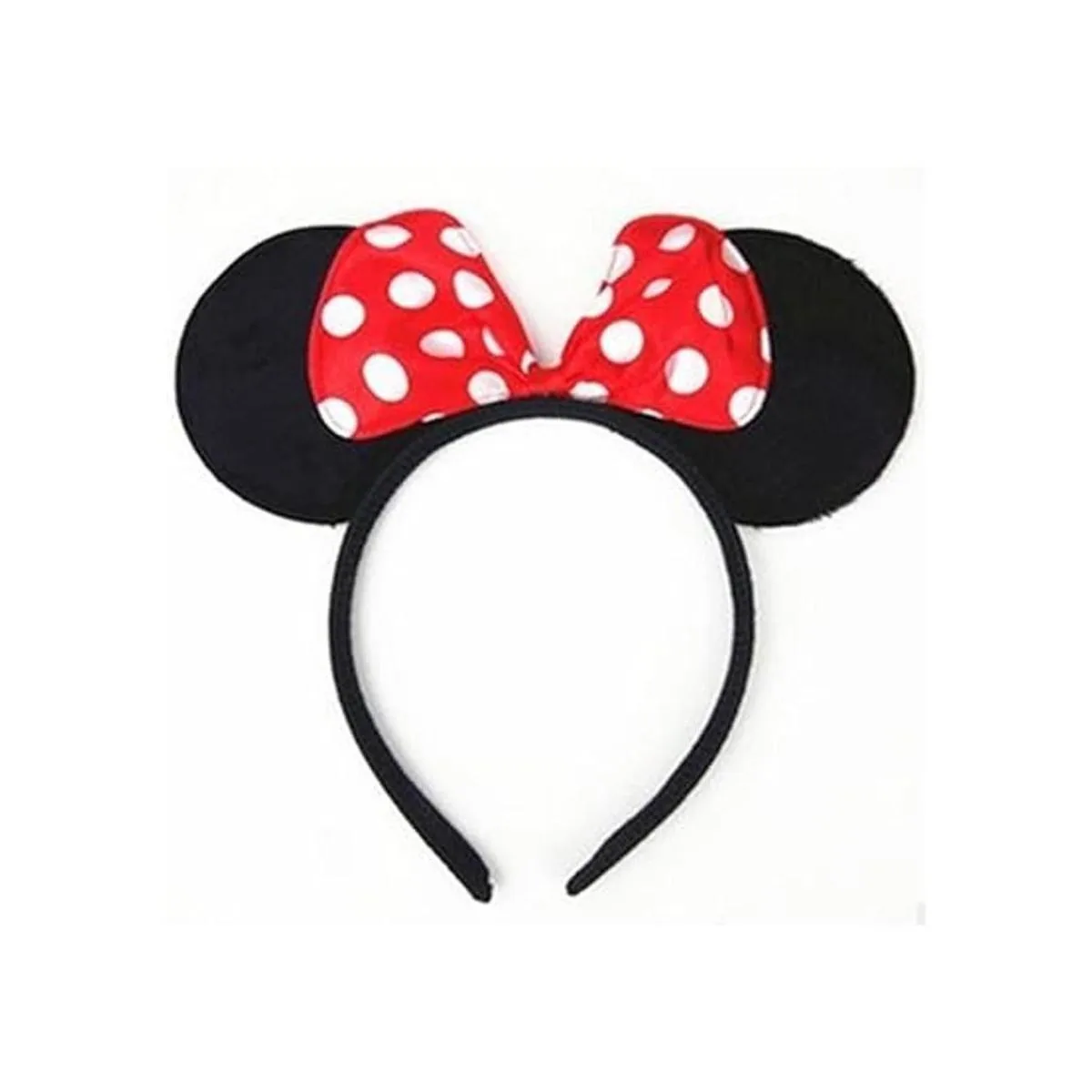 Diseño: orejas grandes de Minnie Mouse, lazo rojo con lunares blancos.