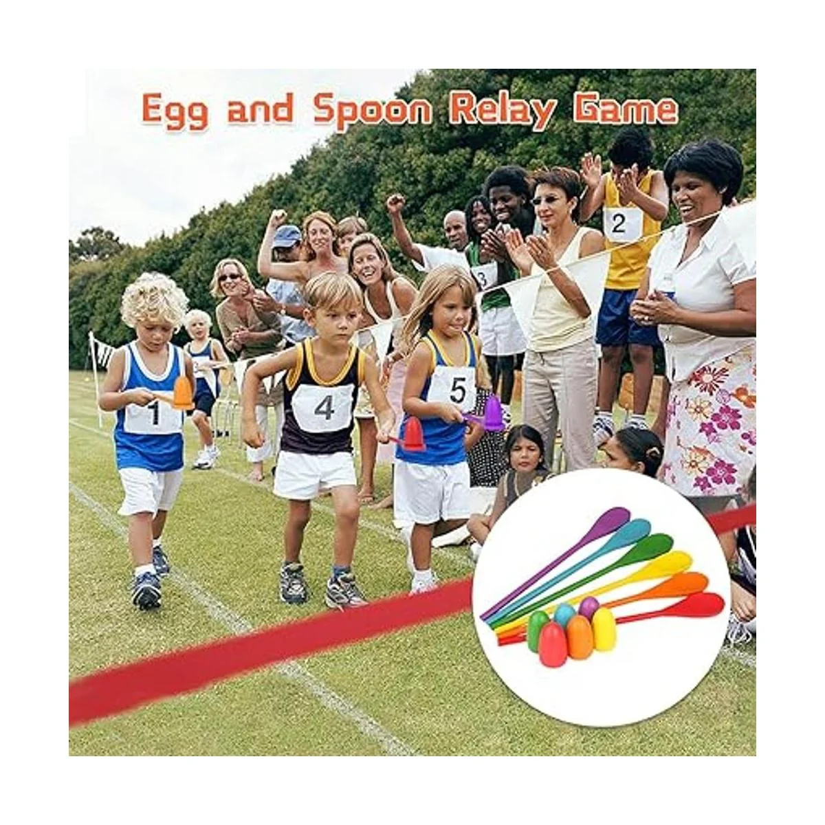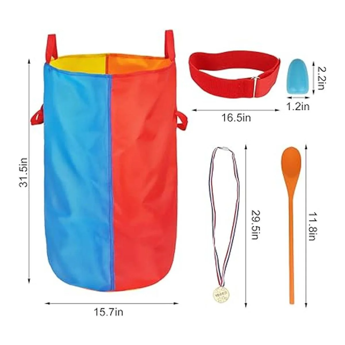 Juego divertido de gran valor: nuestro juego de césped al aire libre incluye 4 coloridas bolsas de carreras de saco de patatas, el tamaño perfecto de 31.5 x 15.7 pulgadas para niños y adultos. Juego de 6 juegos de cucharas de huevo de madera, 4 bandas de relé de 3 patas con correa elástica ajustable, y con 10 medallas de oro de plástico, un total de 30 piezas, adecuado para 410 jugadores